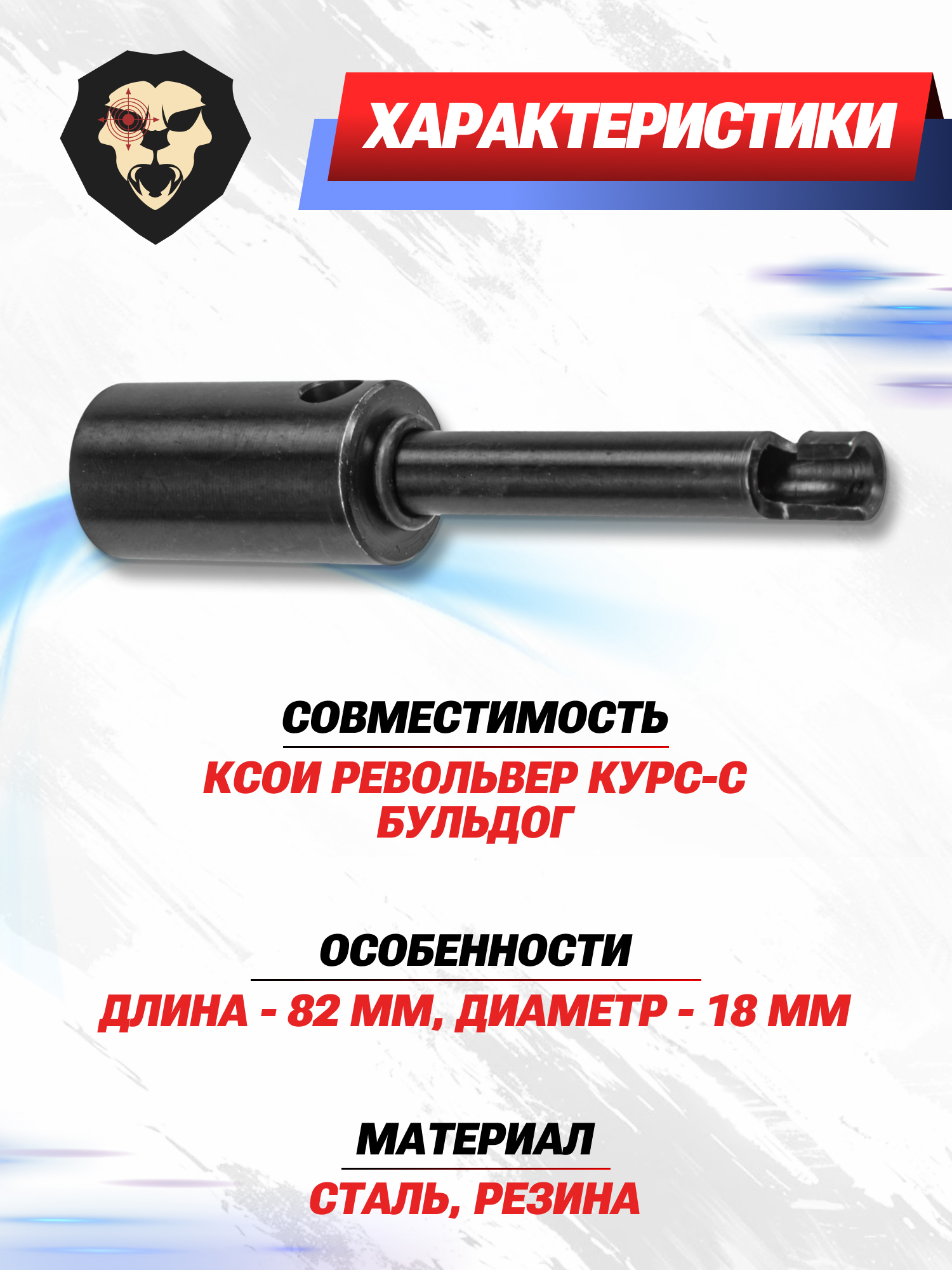 Мортира Kurs характеризуется длиной 82 мм, тогда как диаметр пусковой части составляет 18 мм. Погружать конструкцию в бланк револьвера следует до упора в резиновое кольцо-ограничитель, что создает необходимый зазор для корректной работы. Спил хвостовика при этом должен располагаться над штифтом в стволе оружия, после чего требуется повернуть изделие по часовой стрелке на 90 градусов для фиксации.