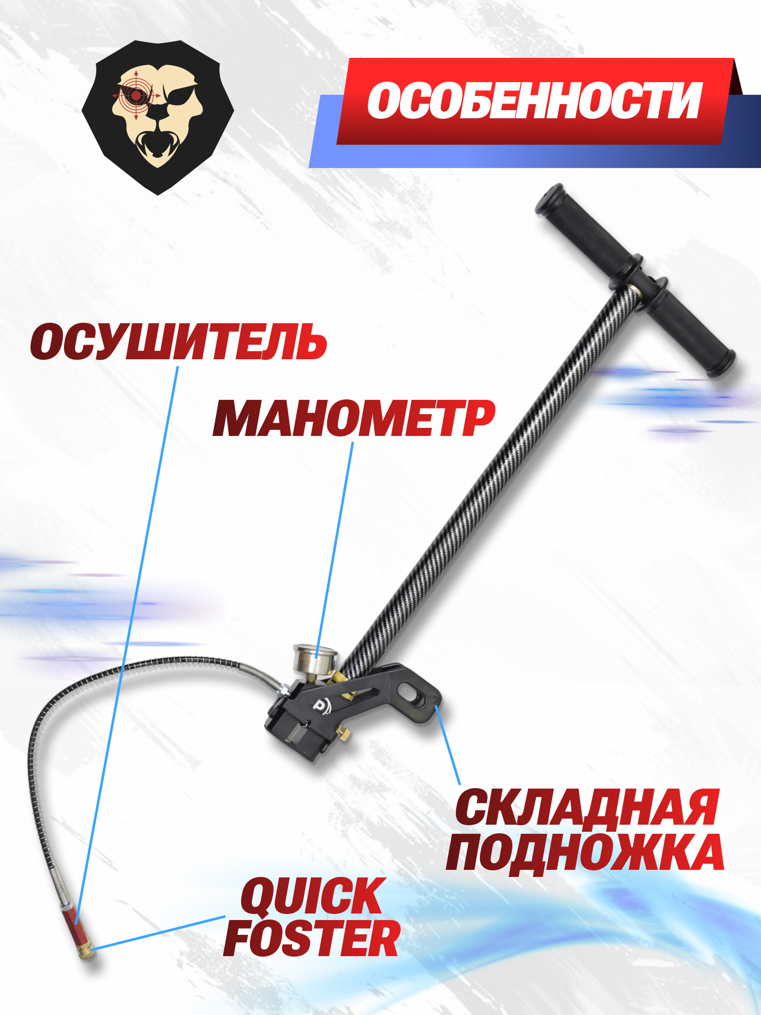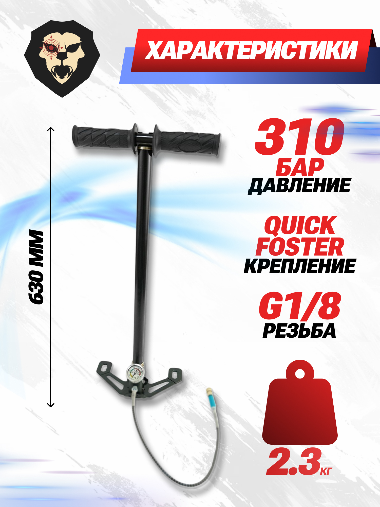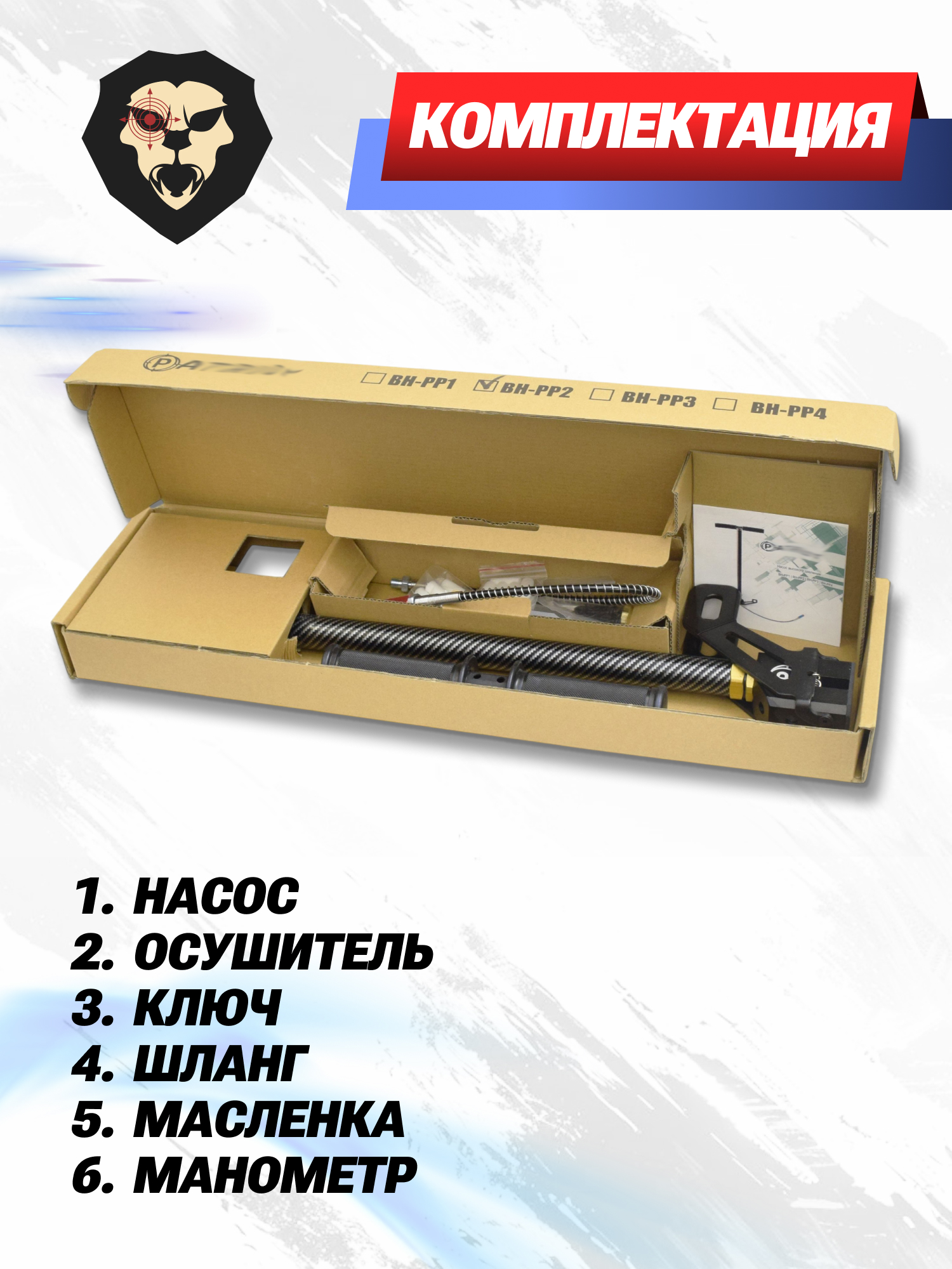 Насос относится к трехступенчатому типу и способен нагнетать воздух под давлением в 310 Бар. Для контроля показателей при заправке пневматики в корпус вкручивается жидкостный манометр с информативной, хорошо различимой шкалой. Чтобы предотвратить попадание в ресивер PCP винтовки или пистолета мелкофракционной пыли и отделить из закачиваемого воздуха излишнюю влагу, пригодится специальный фильтр осушитель - этот элемент конструкции насоса также входит в набор поставки.
