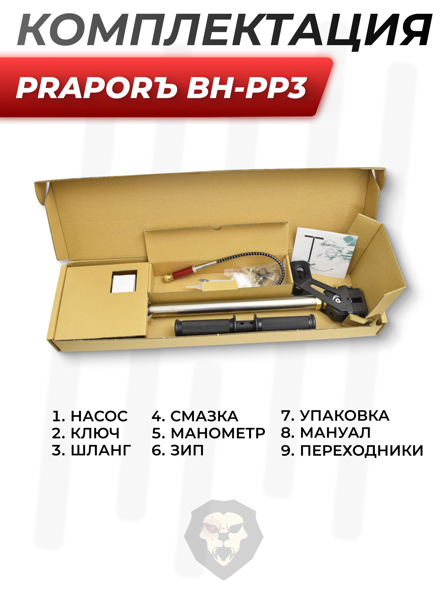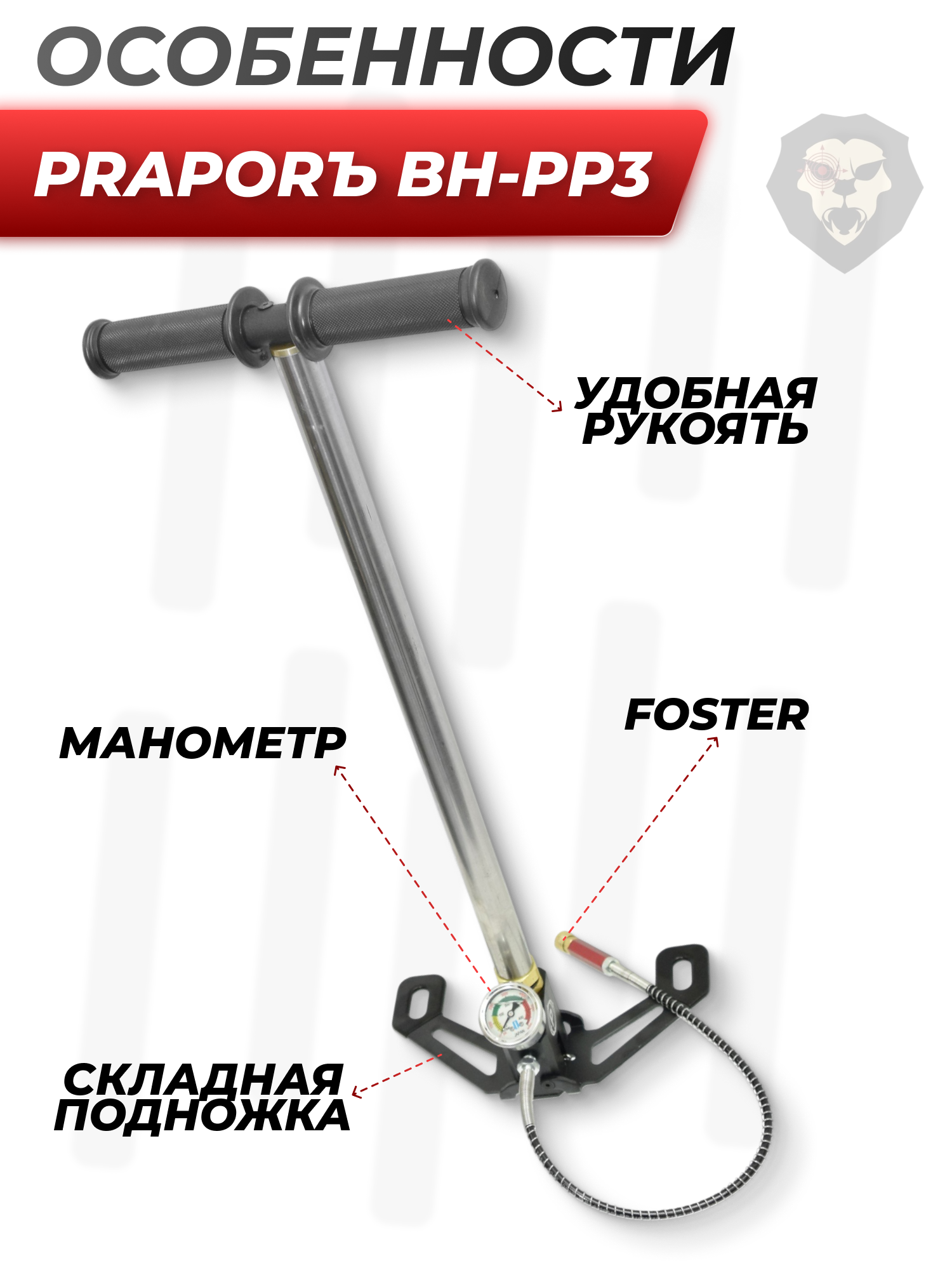 Рассматриваемое изделие предназначено для заправки как ПСП пистолетов, так и пневматических винтовок. Насос высокого давления Praporъ имеет в комплекте прорезиненный армированный шланг, который устанавливается в основание корпуса посредством резьбовой части G1/8. С обратной стороны на трубке смонтирован коннектор с быстросъемным соединением Foster «папа» для подключения подходящих штуцеров.