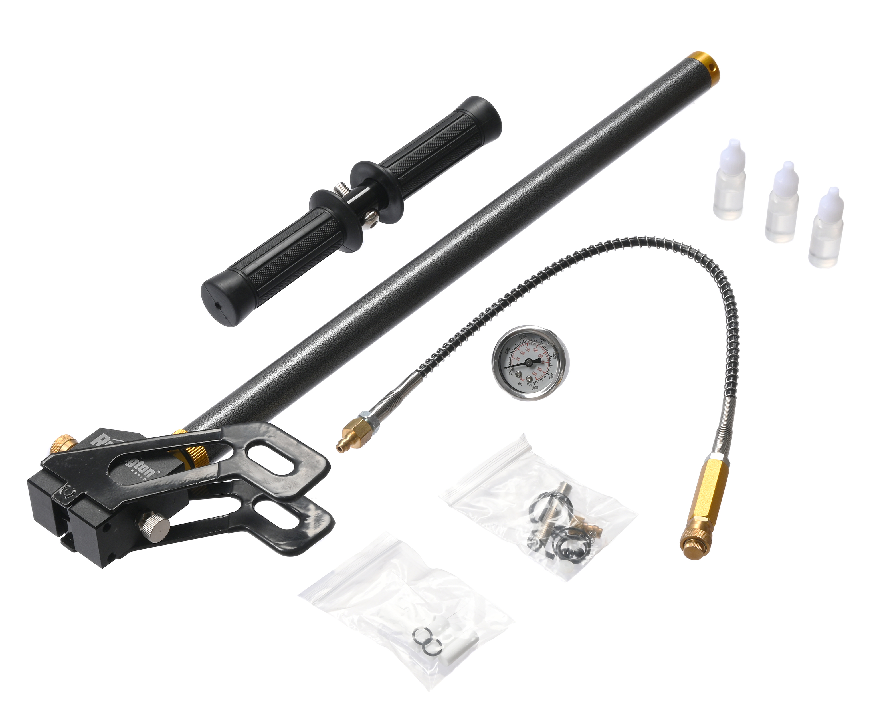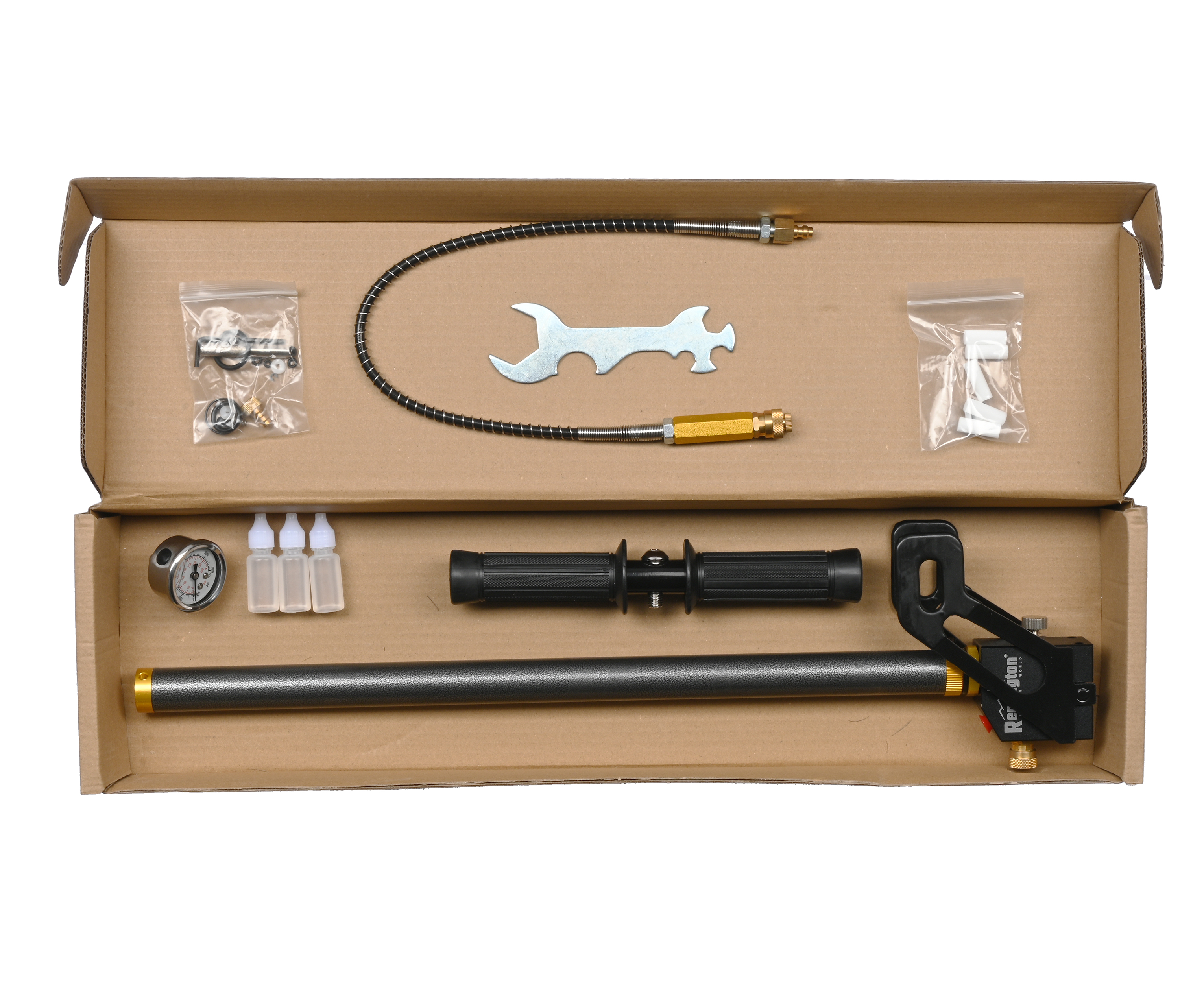 В комплекте идет манометр, посредством которого можно оперативно контролировать давление в процессе накачки. Датчик устанавливается в нижний распределительный узел - оный также выделяется наличием стравливающего винта и гнезда G1/8 «мама» под заправочный шланг. Для затягивания соединений набор включает соответствующий инструмент.