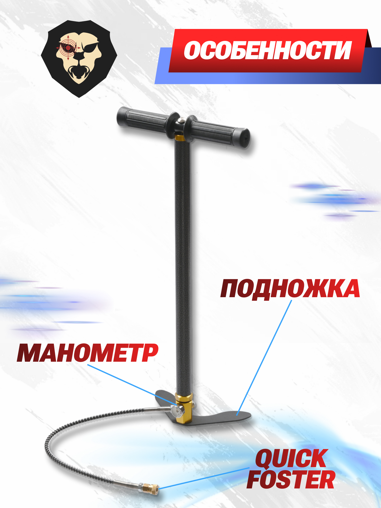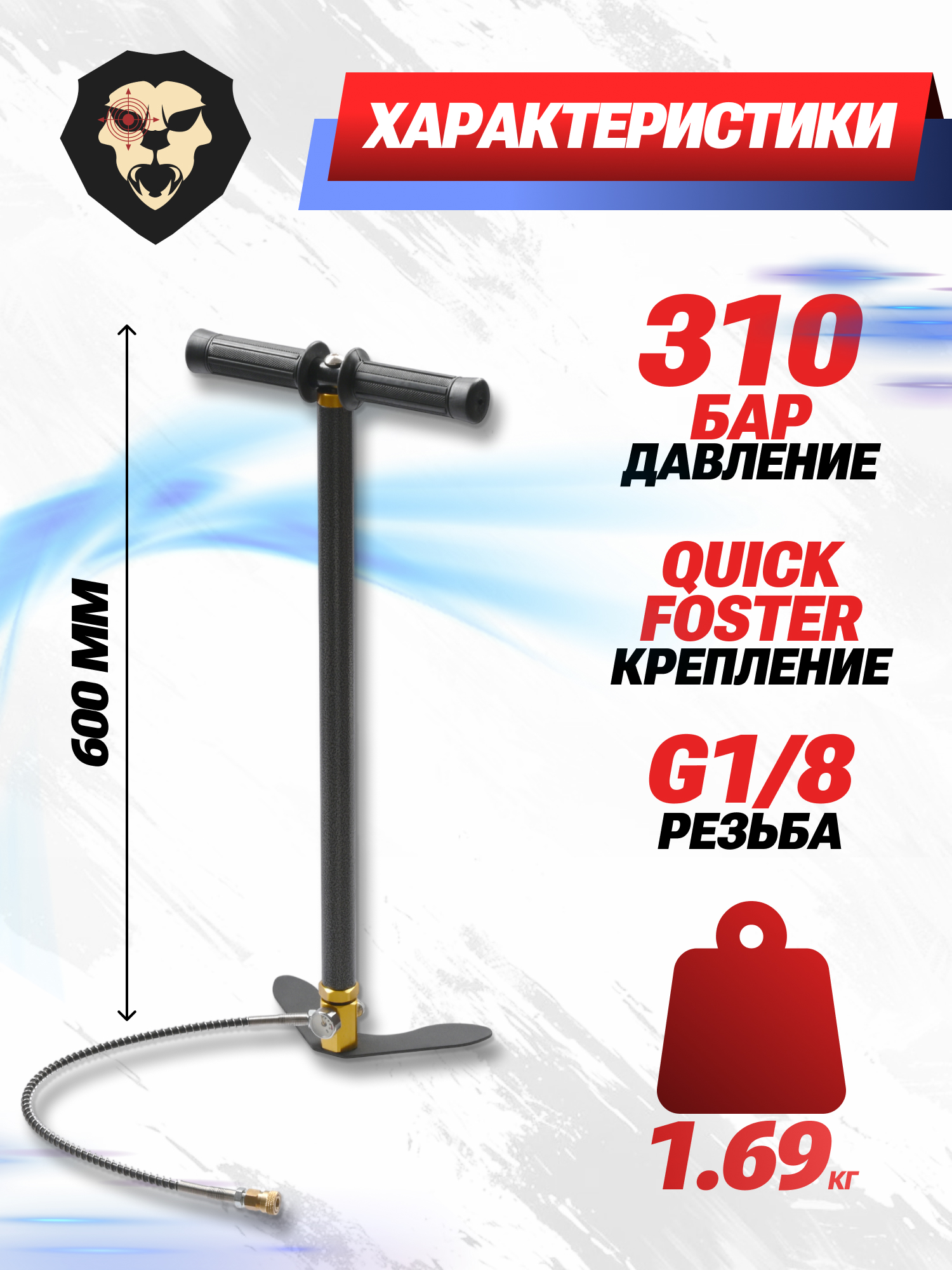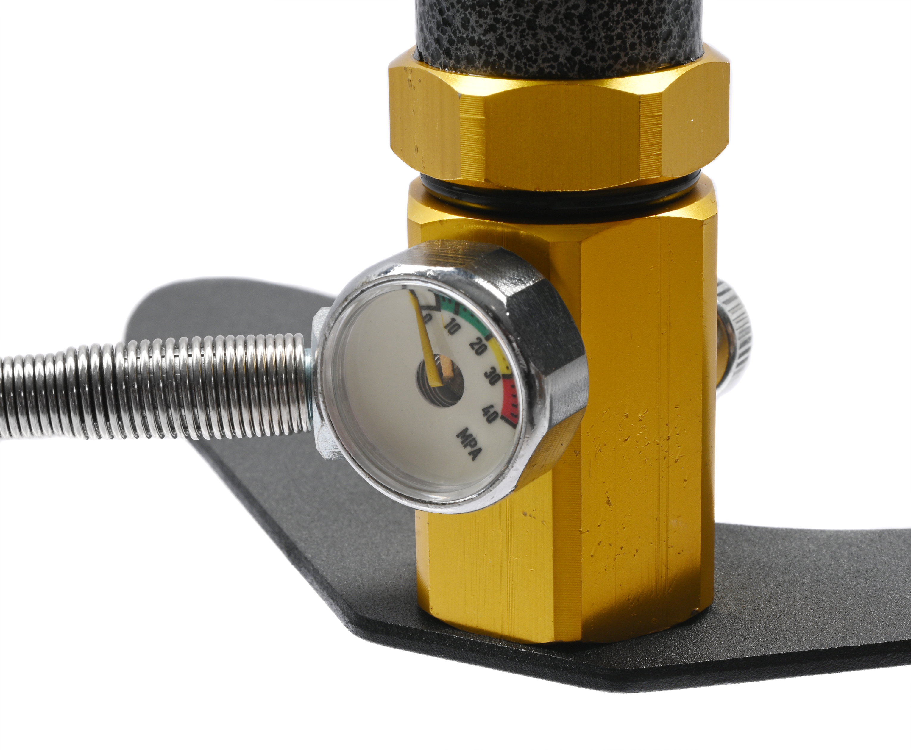 По паспорту изделие выдает максимальное давление 310 Бар. Благодаря таким характеристикам насос спокойно справится с накачкой воздухом стандартных ресиверов пневматического оружия. Из комплектации стоит выделить наличие манометра, посредством которого показатель заполнения контролируется в реальном времени.