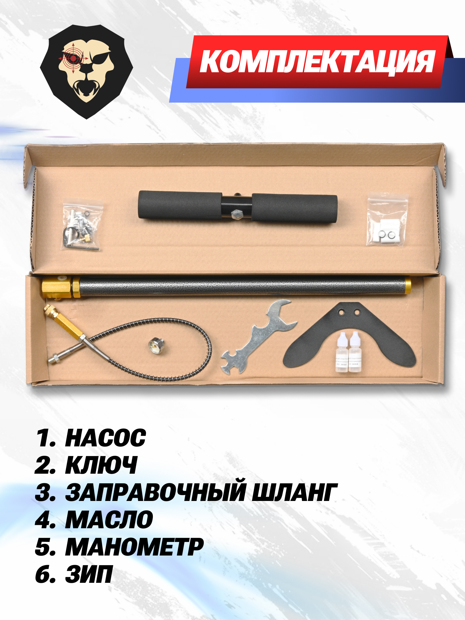 | Комплектация | Насос, ключ, заправочный шланг, масло, манометр, ЗИП, упаковка |