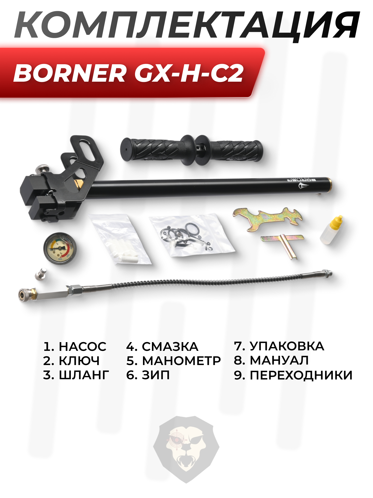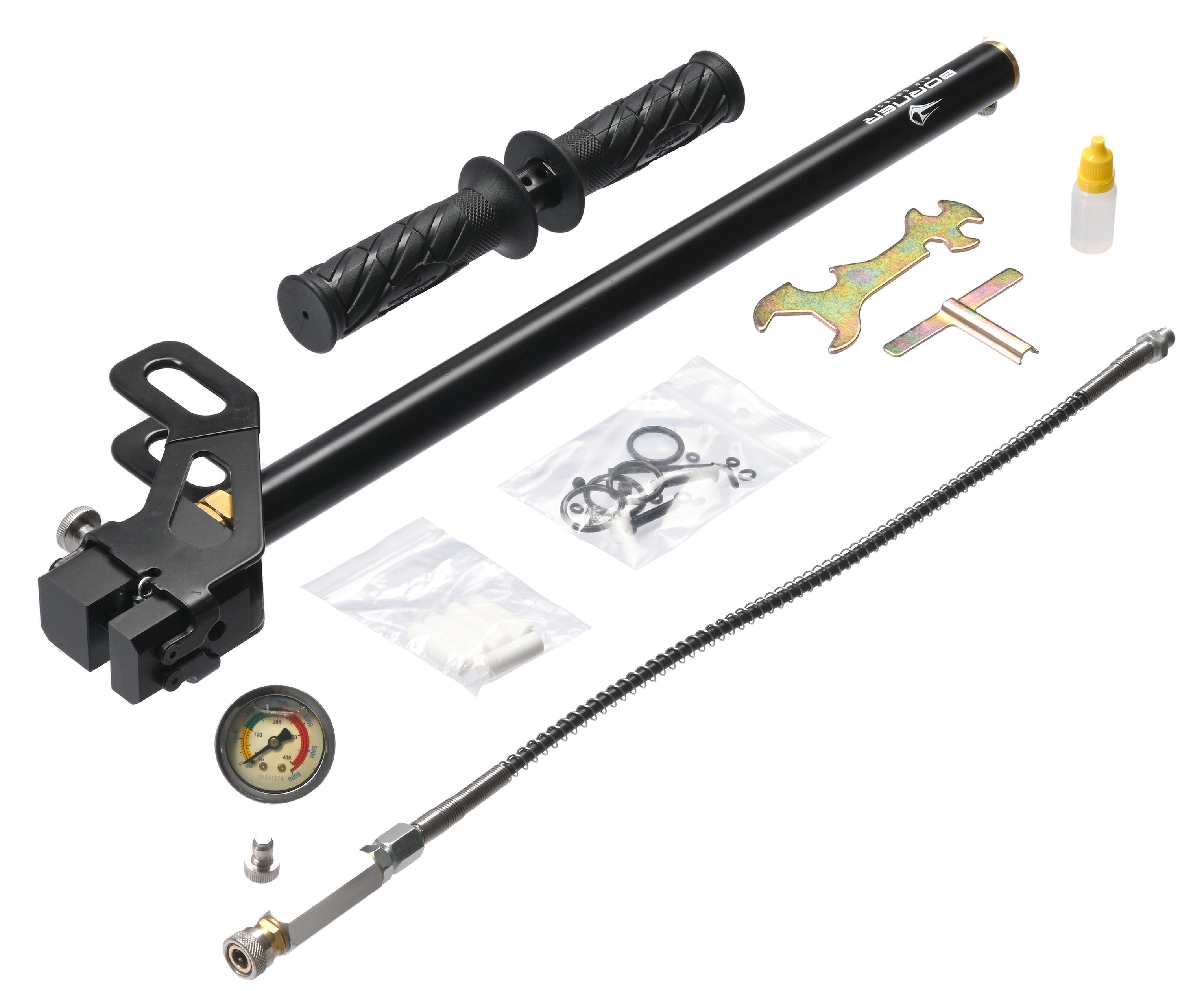 Ручной насос высокого давления для PCP Borner комплектуется штатным резиновым шлангом, который подкрепляется металлической проволокой - последний устанавливается в нижний разъем с резьбой G1/8. Также в поставку включены переходники с масленкой и запасной набор прокладок.
