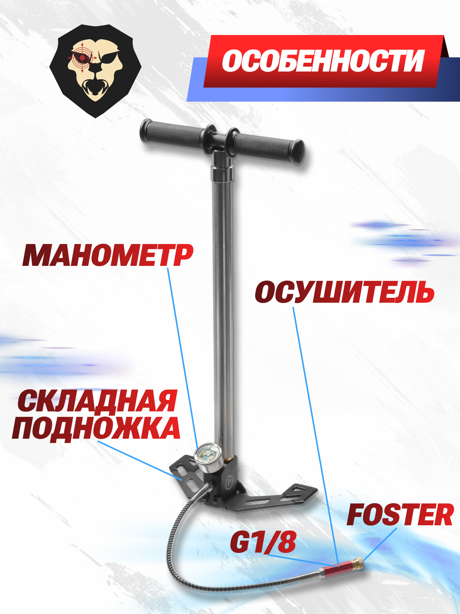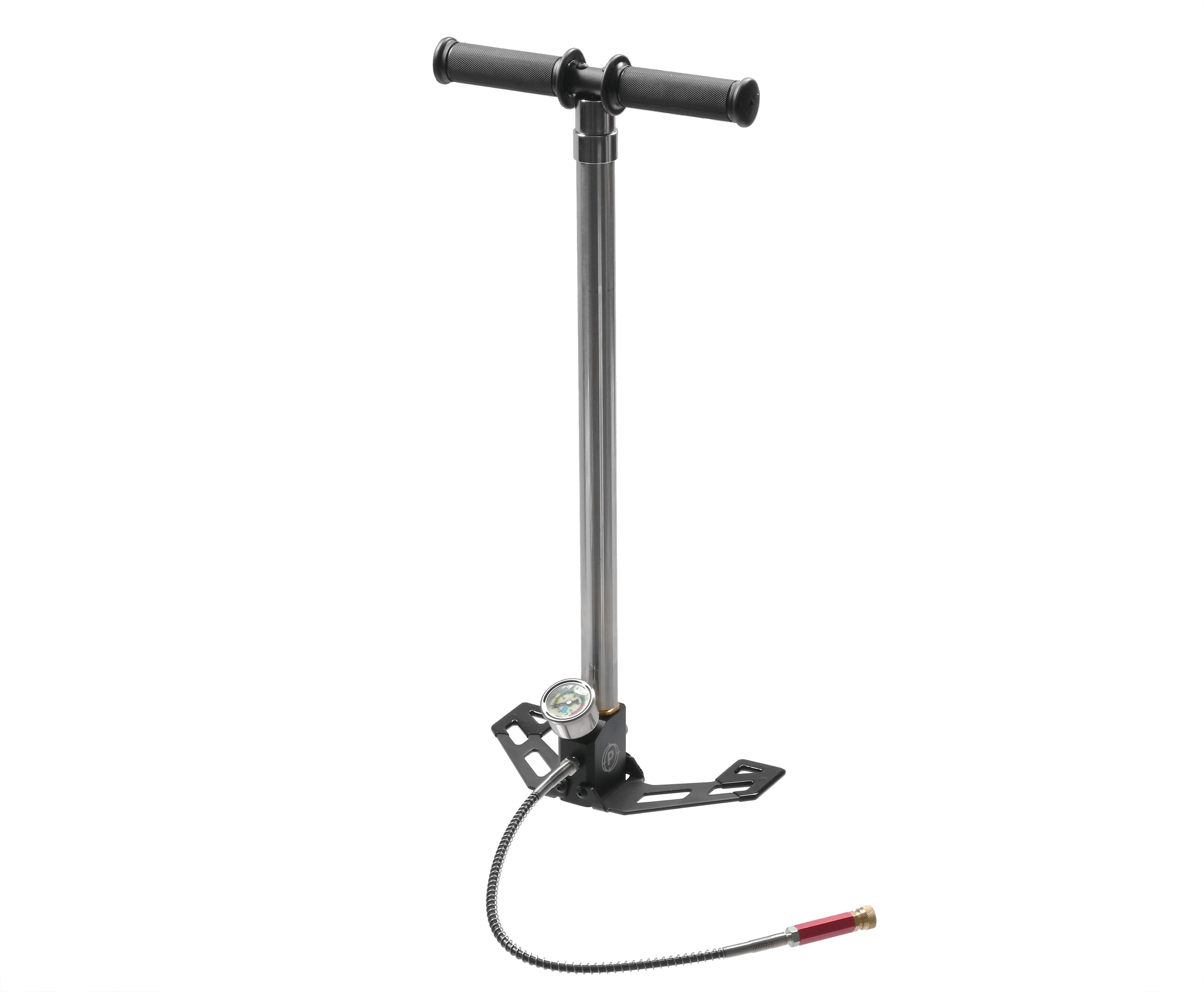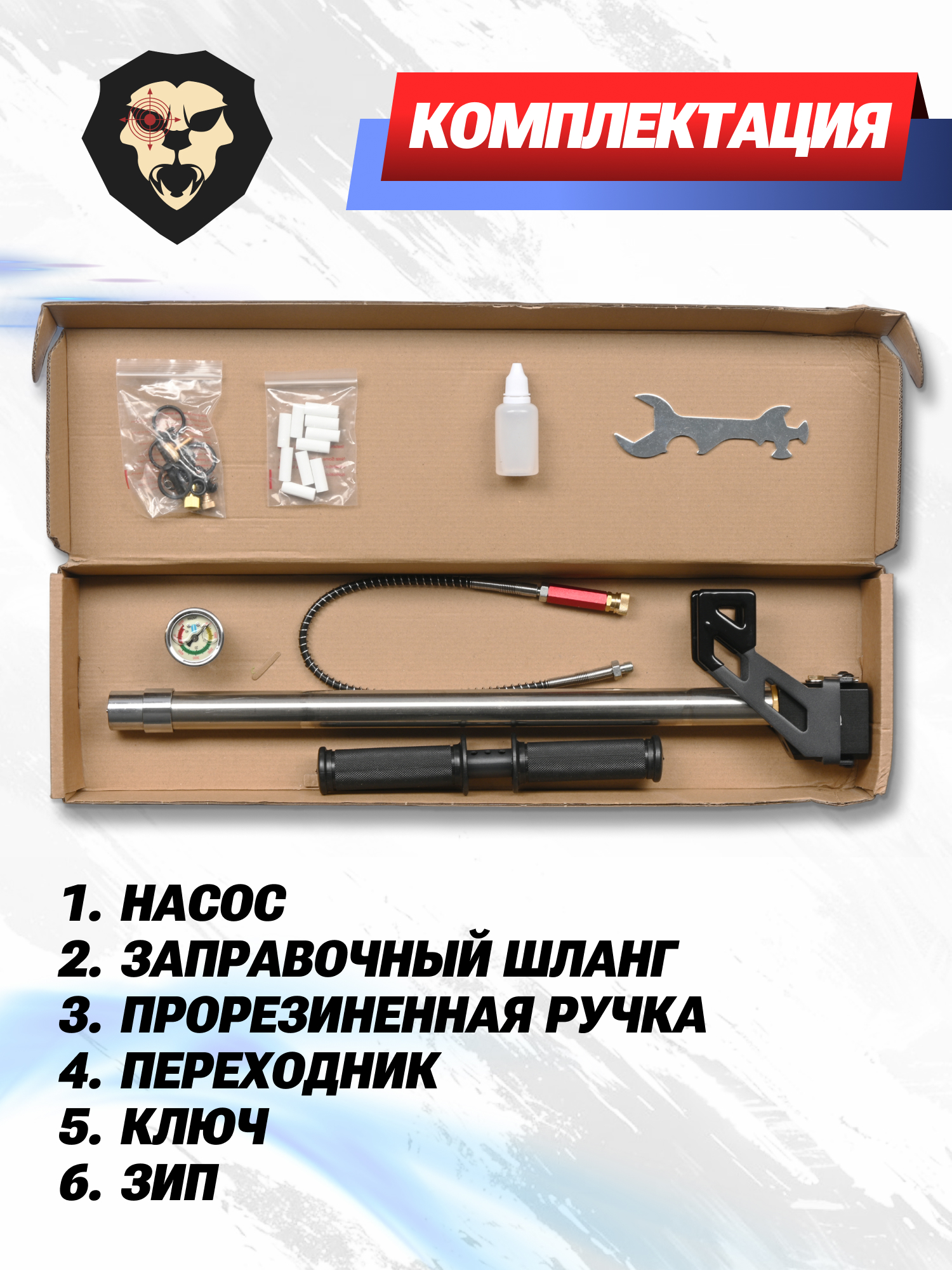 Насос для ПСП винтовки выполнен из высокопрочной стали, которая устойчива к внешним механическим воздействиям - в сложенном состоянии габариты насоса не превышают 63 миллиметров, а при верхнем положении поршня длина составляет 112 мм. Эргономичная прорезиненная рукоятка предотвращает скольжение рук владельца, а нижние упоры для ступней необходимы для устойчивости во время накачки.