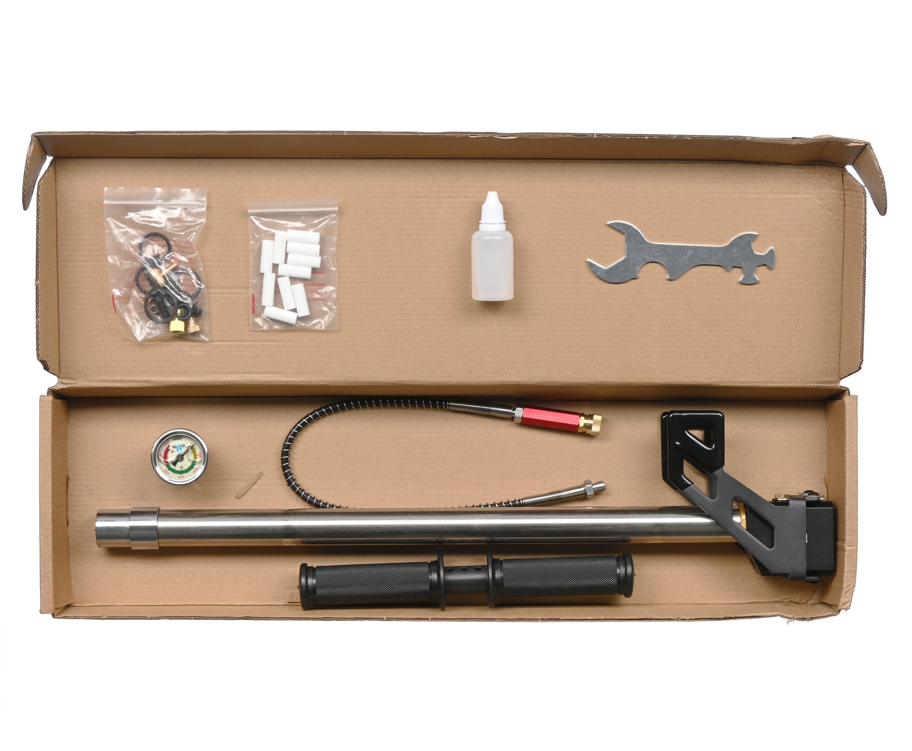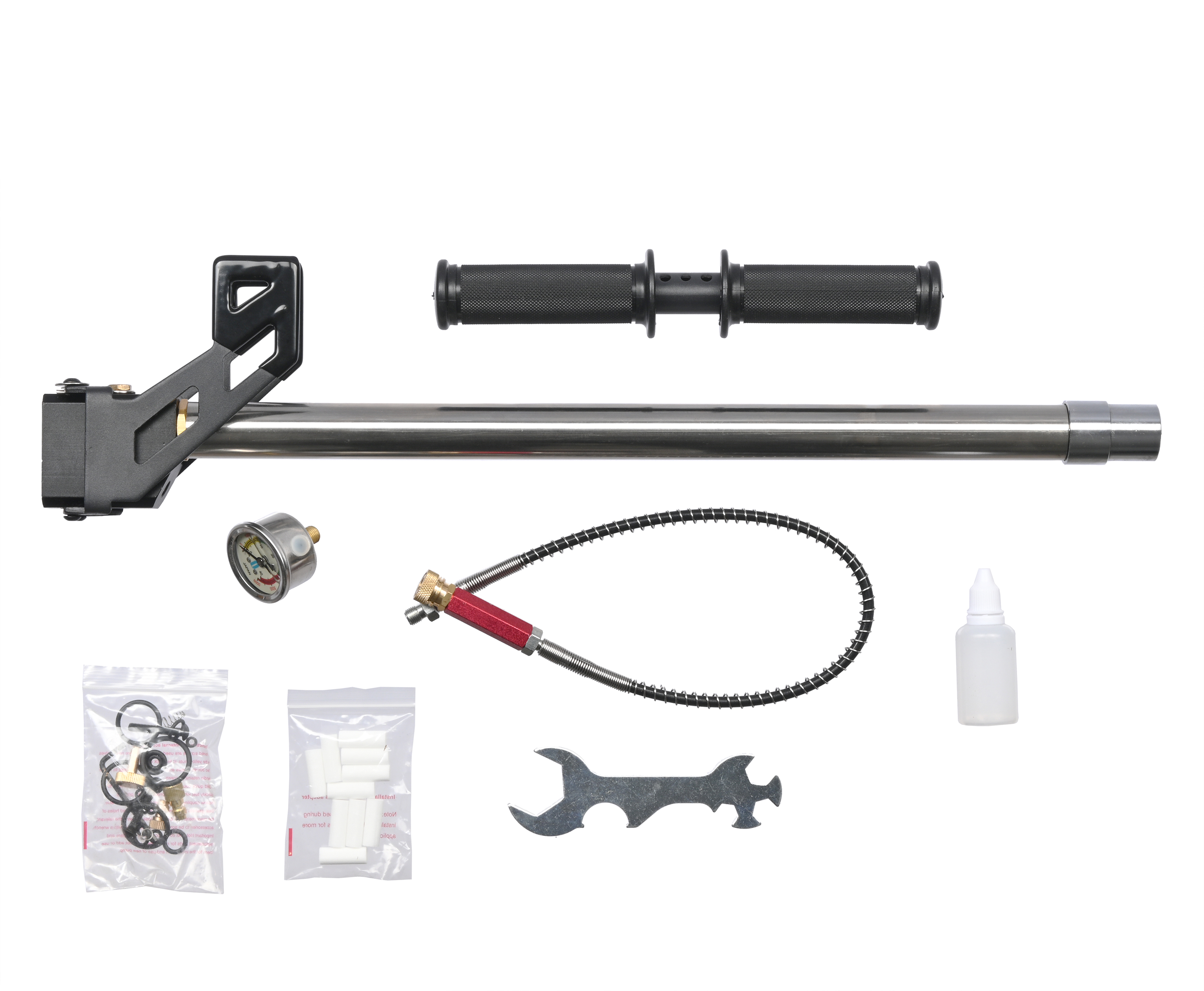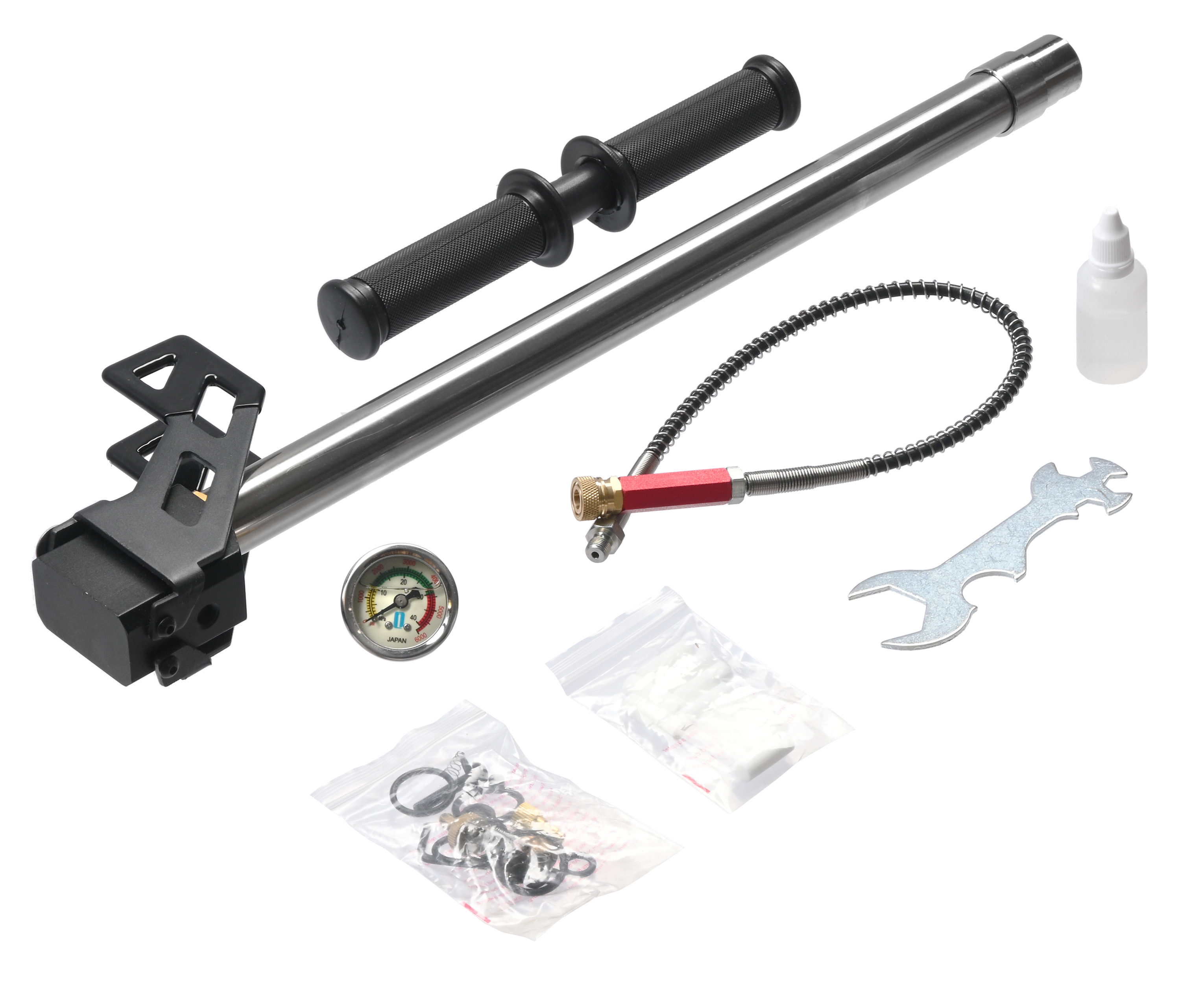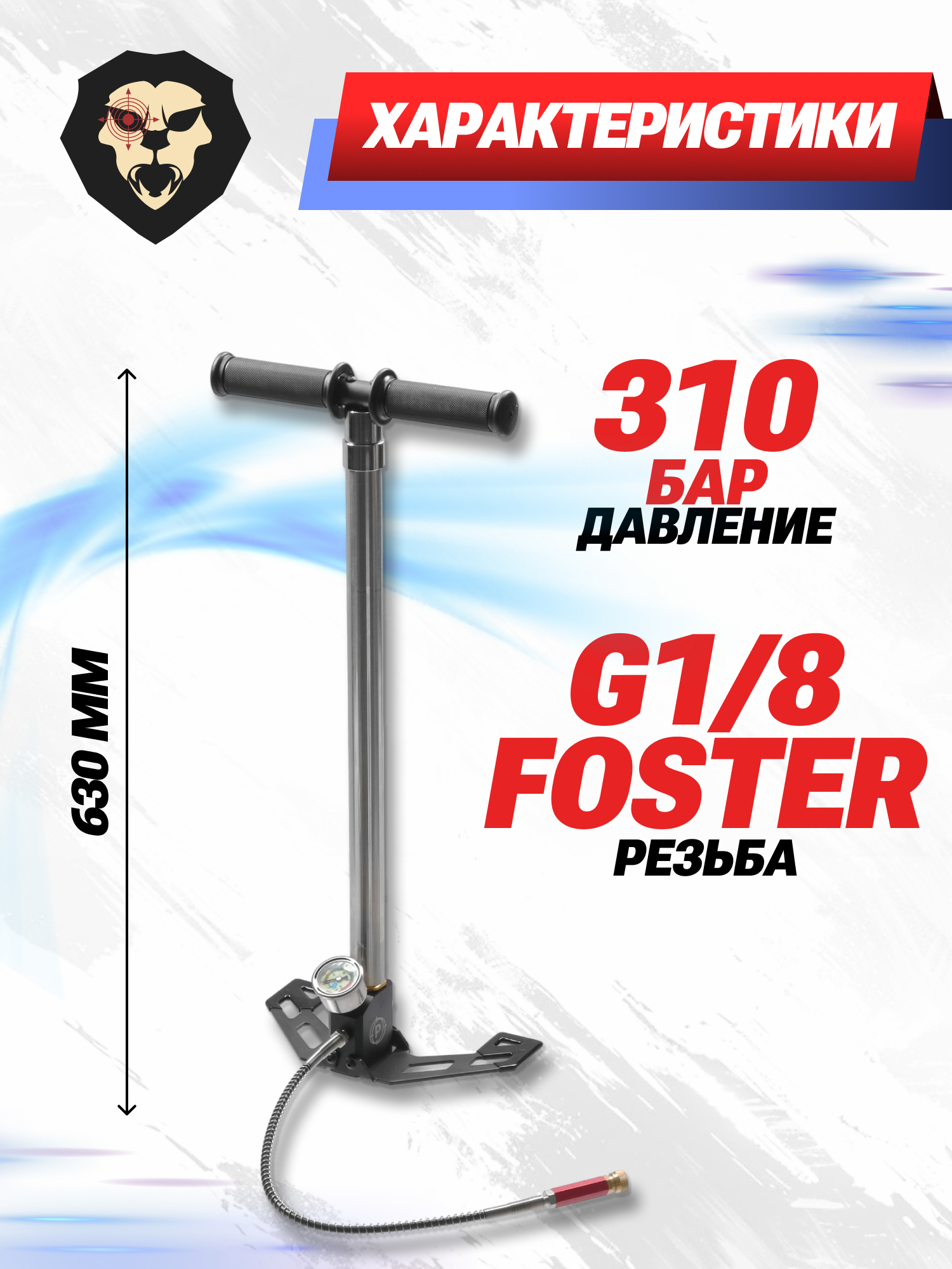 Насос для ПСП винтовки выполнен из высокопрочной стали, которая устойчива к внешним механическим воздействиям - в сложенном состоянии габариты насоса не превышают 63 миллиметров, а при верхнем положении поршня длина составляет 112 мм. Эргономичная прорезиненная рукоятка предотвращает скольжение рук владельца, а нижние упоры для ступней необходимы для устойчивости во время накачки.