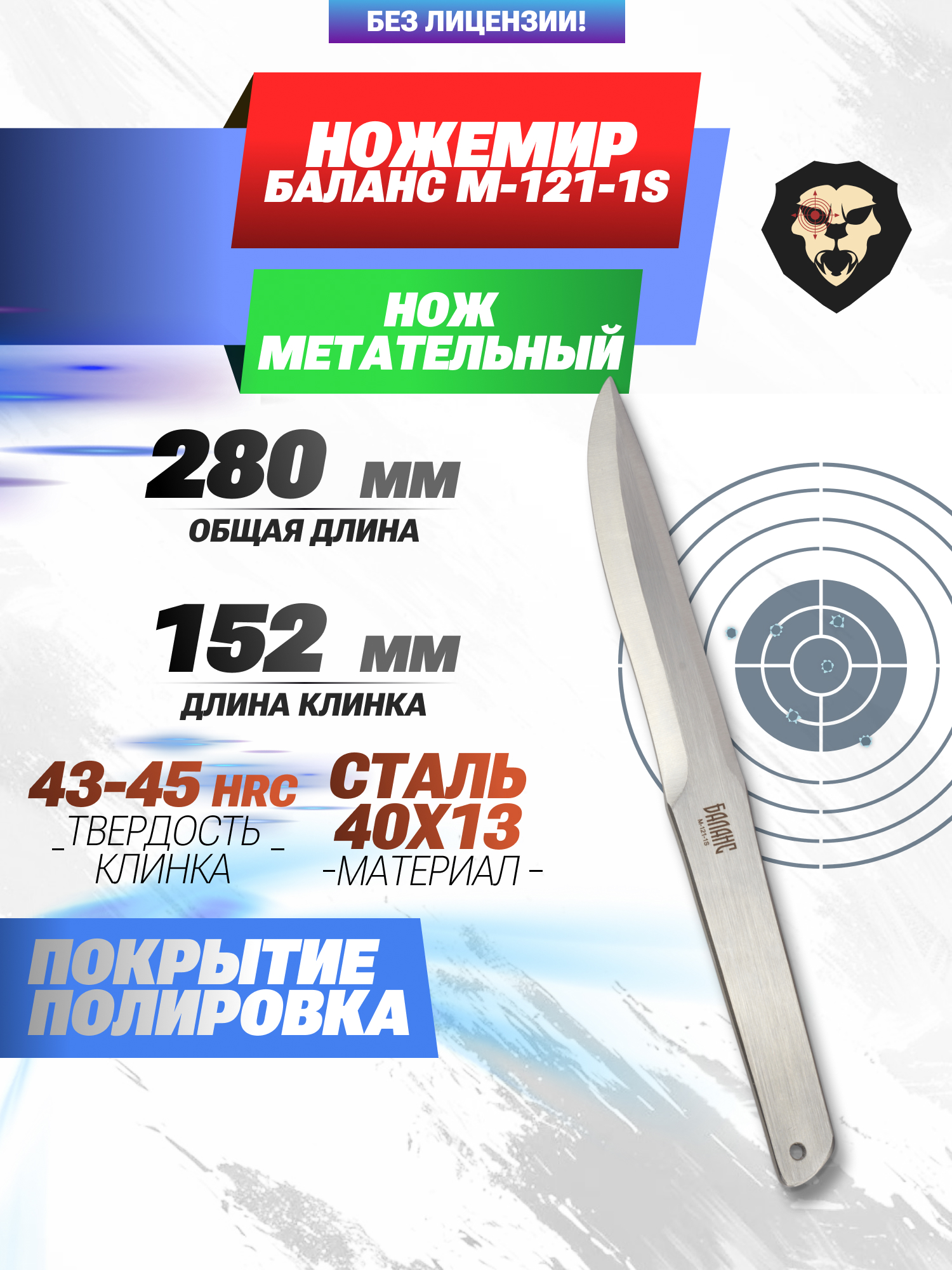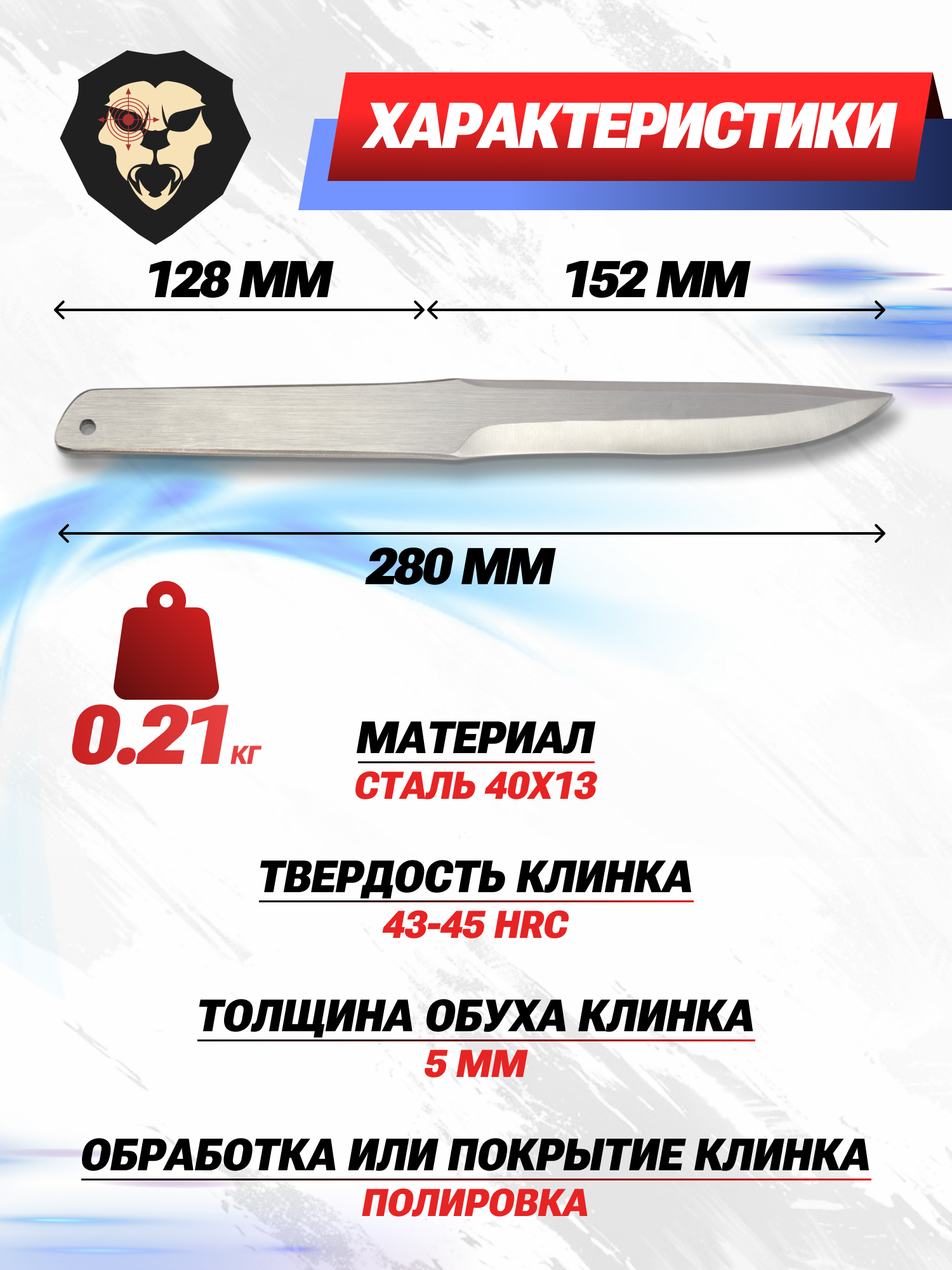 Метательные ножи Баланс Ножемир не затачиваются, что исключает вероятность травмирования ладони при броске и в момент извлечения из щита. В обозреваемой модели клинок имеет форму Drop Point. Лезвийная часть характеризуется длиной 152 миллиметра, тогда как общий размер изделия - 280 мм.
