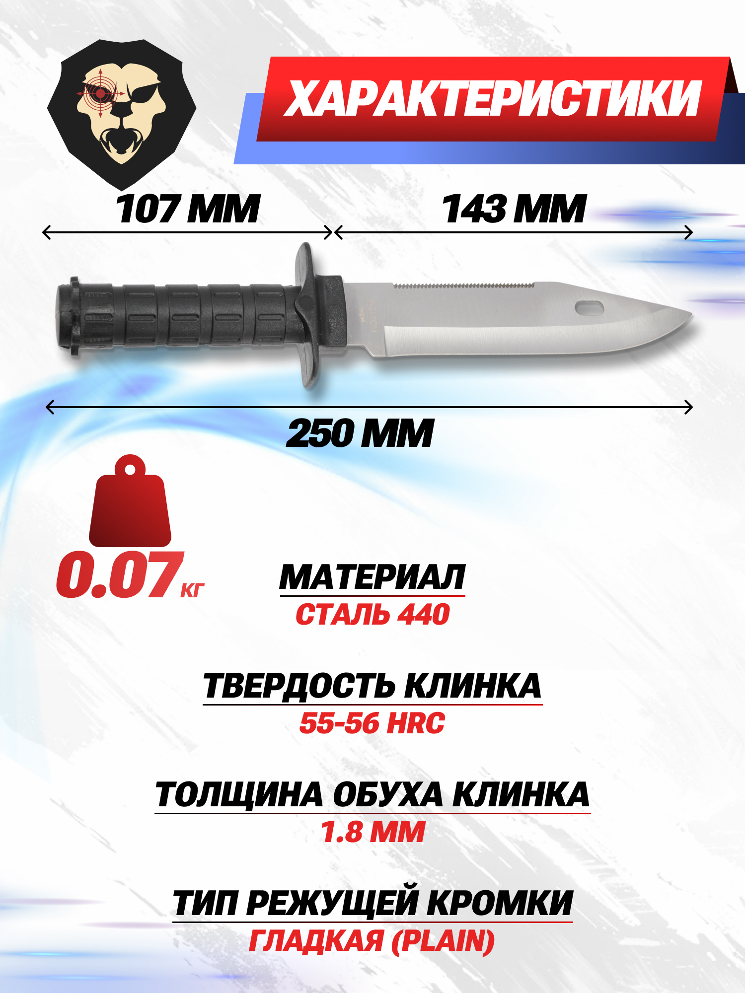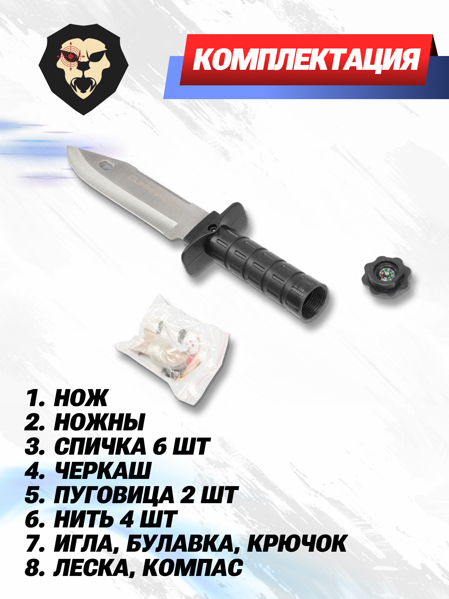 | Комплектация | Нож, ножны, спичка - 6 шт, черкаш, пуговица - 2 шт, нить - 4 шт, игла, булавка, крючок, леска, компас, упаковка |