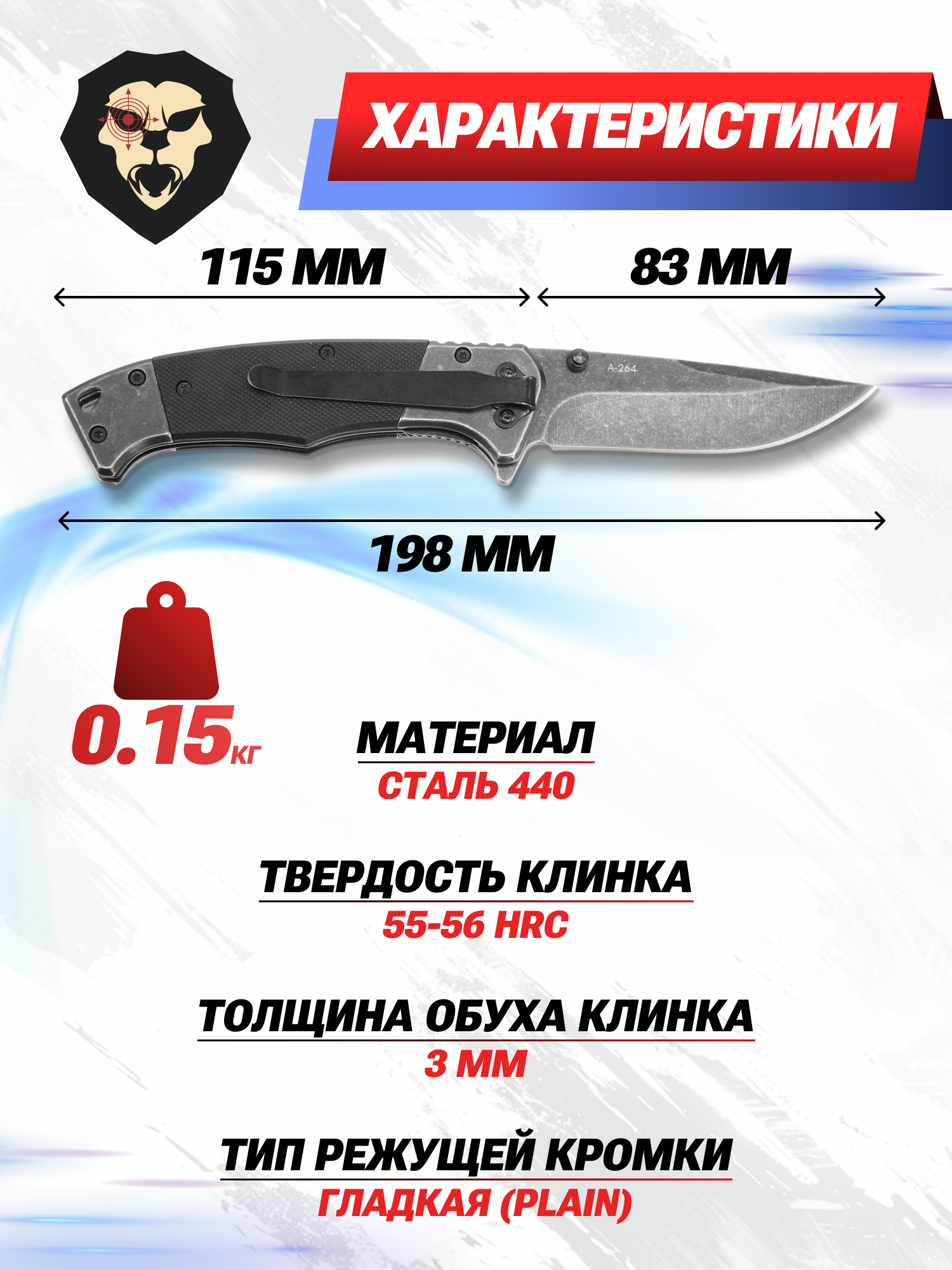 Сам клинок формы Drop Point исполнен с применением нержавеющей стали 440, а ее твердость после процедуры закалки - от 55 до 56 единиц шкалы Роквелла. Длина рабочей части составляет 83 миллиметра, тогда как размер рукояти не превышает 115 мм. Гладкая кромка обеспечивает ровный контролируемый рез, а поддерживать ее остроту можно как специальными абразивными камнями, так и бытовыми заточными приспособлениями.