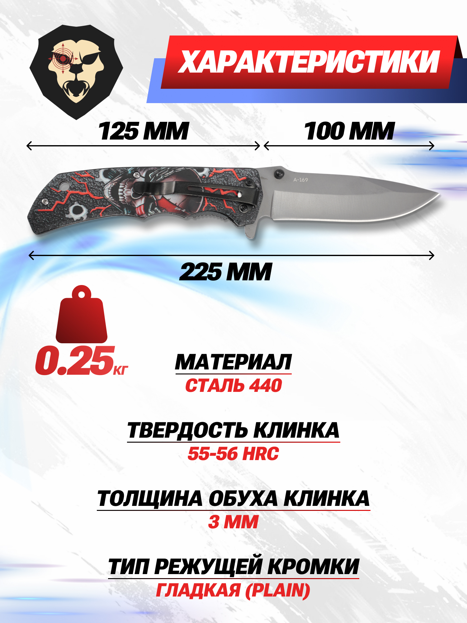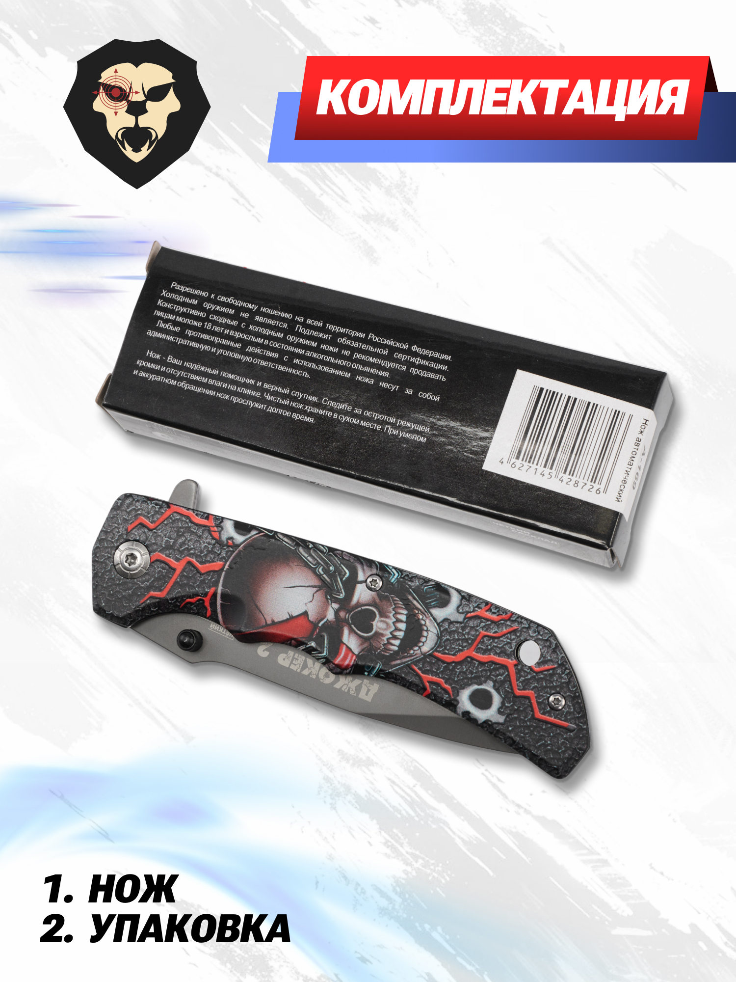 Рукоятка выполнена из металла, что важно для прочности конструкции. Также на озвученную часть ножа нанесен красочный рисунок, благодаря чему приспособление является предпочитаемым подарком для любителей коллекционирования. Помимо этого, производитель предусмотрел наличие отверстия для дополнительного украшения изделия декоративным темляком и специальной клипсы для надежной фиксации в кармане.