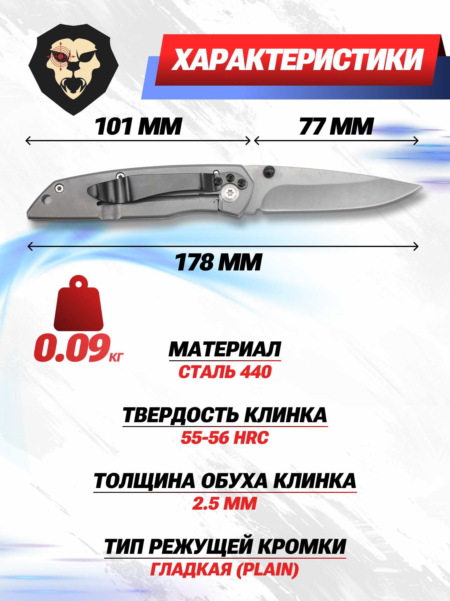 Указанным особенностям соответствует выкидной нож Геккон С-226, который характеризуется строгим классическим дизайном, благодаря чему отлично дополнит деловой городской стиль владельца. Модель выполнена из 440 стали с увеличенной стойкостью к коррозии - таким образом, клинку не требуется специальный уход. В свою очередь, рукоятка изготавливается из металла и имеет матовое серебристое покрытие.
