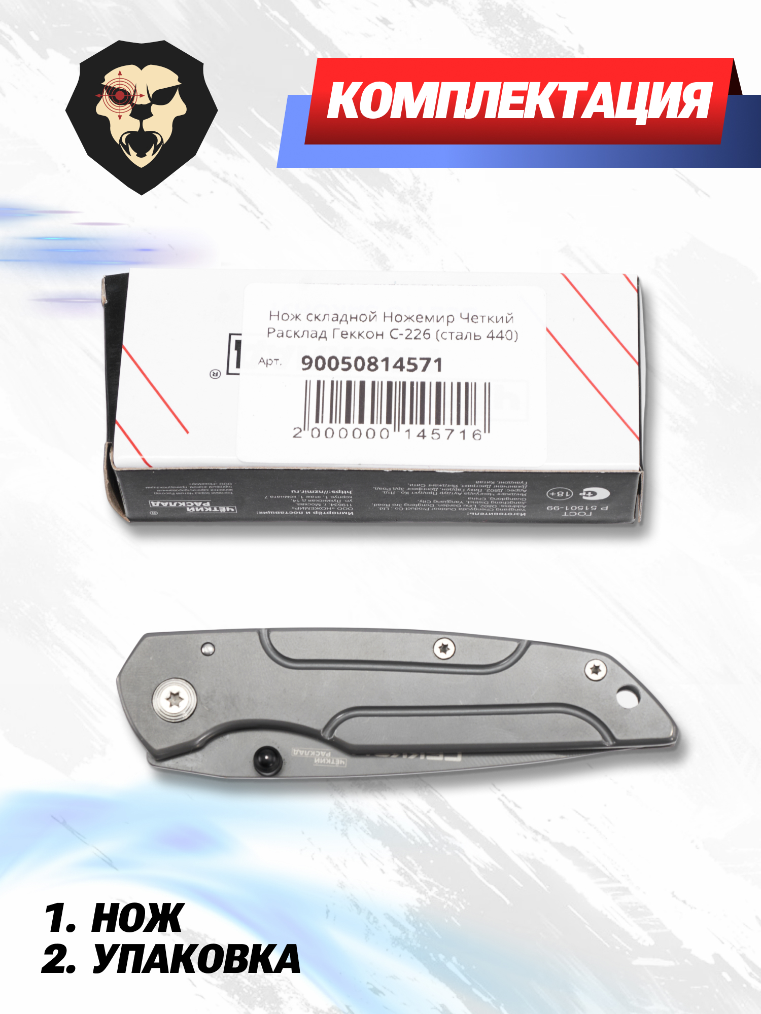 Артикул производителя C-226 Нож складной Ножемир Четкий Расклад Геккон C-226 (сталь 440) по низкой цене 862 руб. Модель со штрихкодом производителя Вы можете оплатить наложенным платежем с доставкой или в отделении транспортной компании (ПЭК, СДЭК, Boxberry). Ваш заказ со штрихкодом 2000000145716 забрать на почте с оплатой при получении в любой части Российской Федерации.