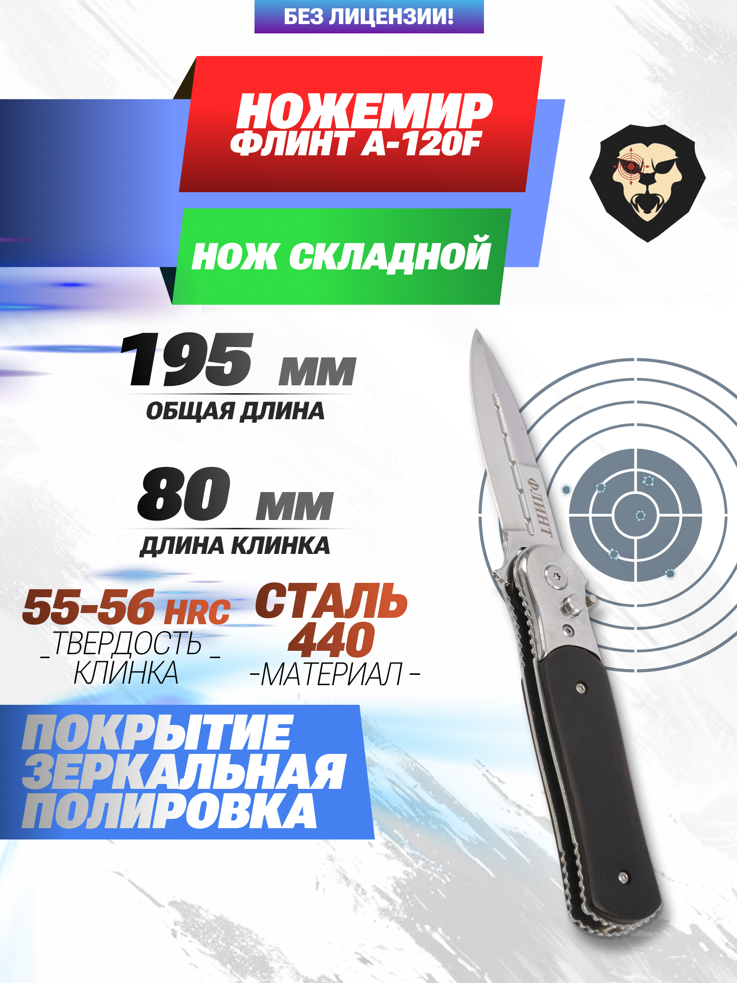 Артикул производителя A-120F Нож складной Ножемир Флинт A-120F (сталь 440, дерево) по низкой цене 1334 руб. Модель со штрихкодом производителя Вы можете оплатить наложенным платежем с доставкой или в отделении транспортной компании (ПЭК, СДЭК, Boxberry). Ваш заказ со штрихкодом 2000000145662 забрать на почте с оплатой при получении в любой части Российской Федерации.