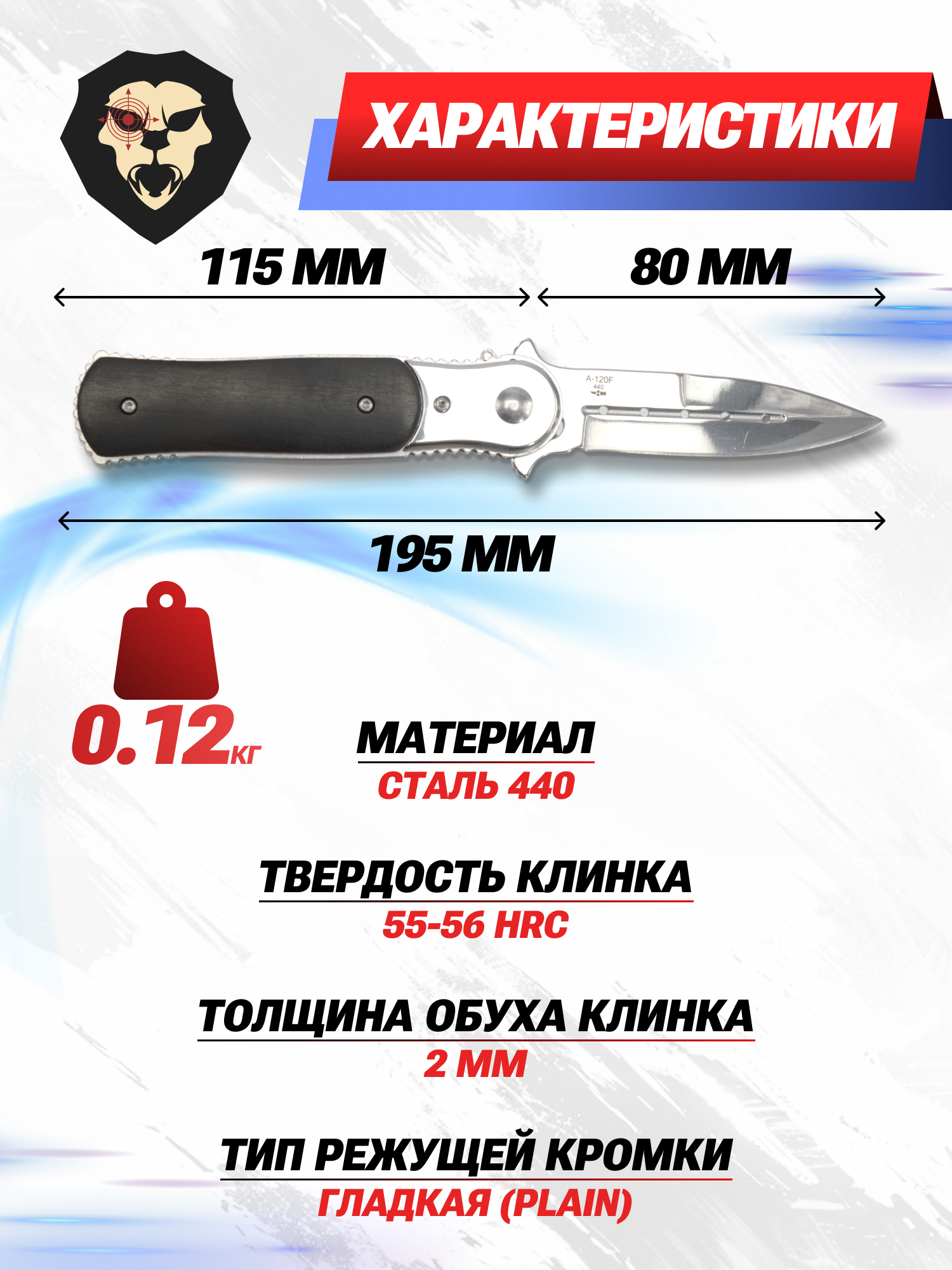 Нож выкидной автоматический A-120F относят к среднему типоразмеру - при полной длине 195 мм, 80 мм из которых отвели клинку, экземпляр остается удобен в большей части работ. Складывая изделие пользователь уменьшает его габарит до 115 мм - такой размер позволит убрать его в карман. В этой модели нет ощутимо выпирающих элементов, за счет чего она не зацепится за окружение и не займет много пространства.