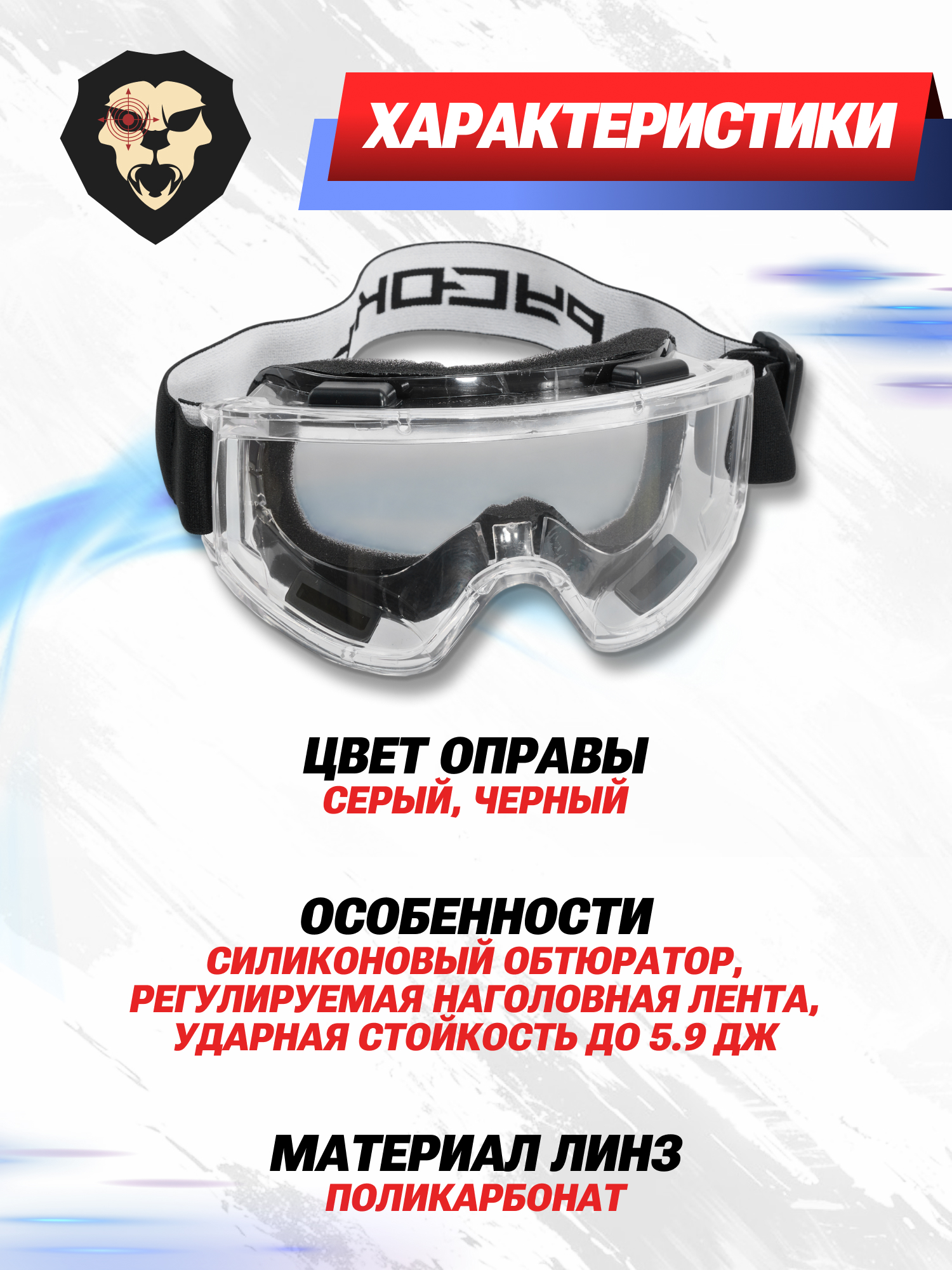 | Особенности | Силиконовый обтюратор, регулируемая наголовная лента, ударная стойкость до 5.9 Дж |