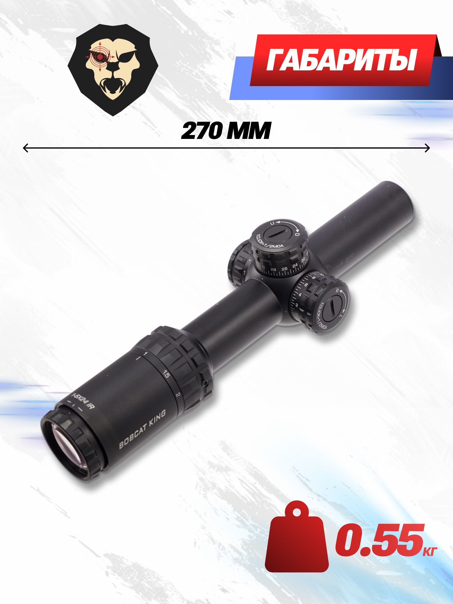 Чтобы установить оптический прицел 1-6x24 Bobcat King HD IR на направляющую планку винтовки применяются всевозможные типы кронштейнов с диаметром кольцевой части 30 миллиметров. За счет применения алюминиевого сплава, выступающего материалом изготовления корпуса устройства, а также компактных габарита в 270 миллиметров, масса конструкции не превышает отметки в 550 грамм.