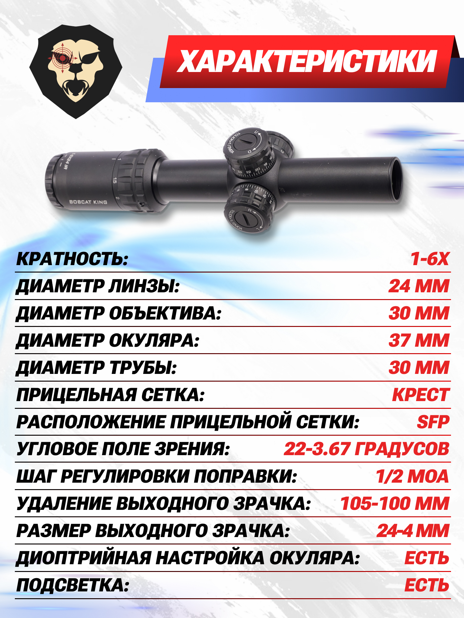 Информация о товаре "Оптический прицел Bobcat King HD 1-6x24 IR (30 мм, подсветка, Крест)" носит ознакомительный характер, и не является публичной офертой, определяемой положениями Статьи 437 Гражданского кодекса Российской Федерации, характеристики, внешний вид, цвет и комплектация могут быть изменены производителем без уведомления.