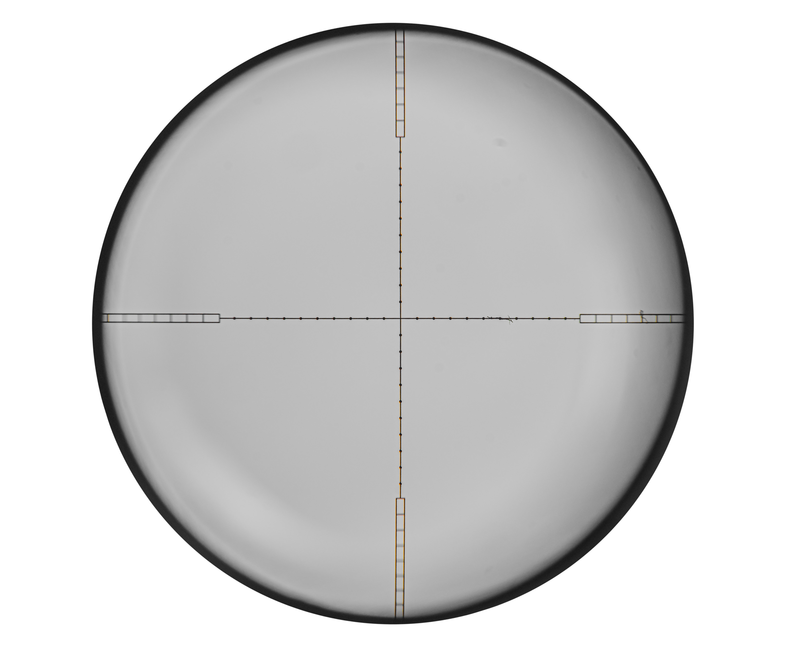 Прицельная сетка выполнена по форме MilDot с рисками на вертикальных и горизонтальных нитях, составляющих перекрестие. Такой вид сетки прицела дает стрелку определить расстояние до цели при знании ее габаритов.