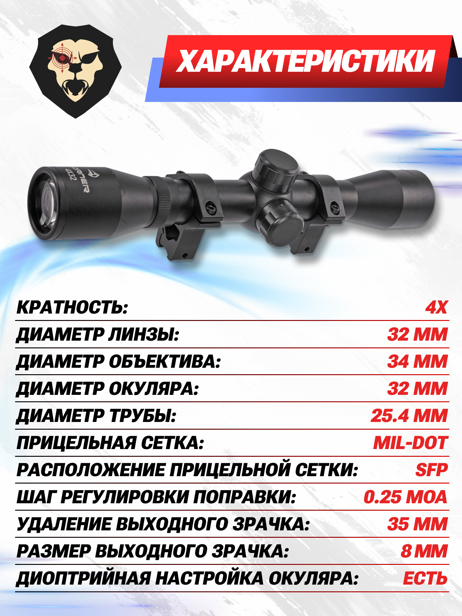 Объектив 32 миллиметра обладает достаточным показателем пропускной способности, а специальный комплекс линз с повышенной прозрачностью повышает видимость. Сетка подвида Мил-дот позволяет вести стрельбу без внесения правок в механизм оружия.