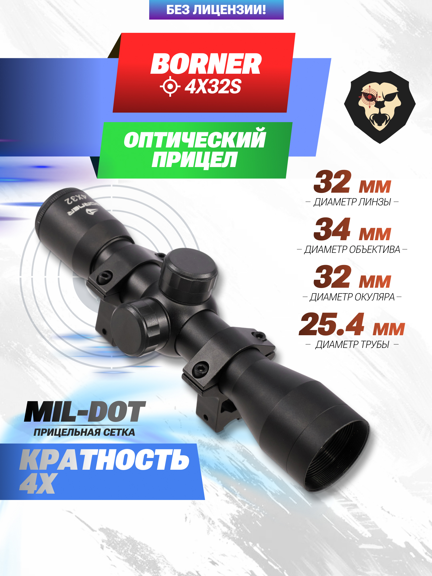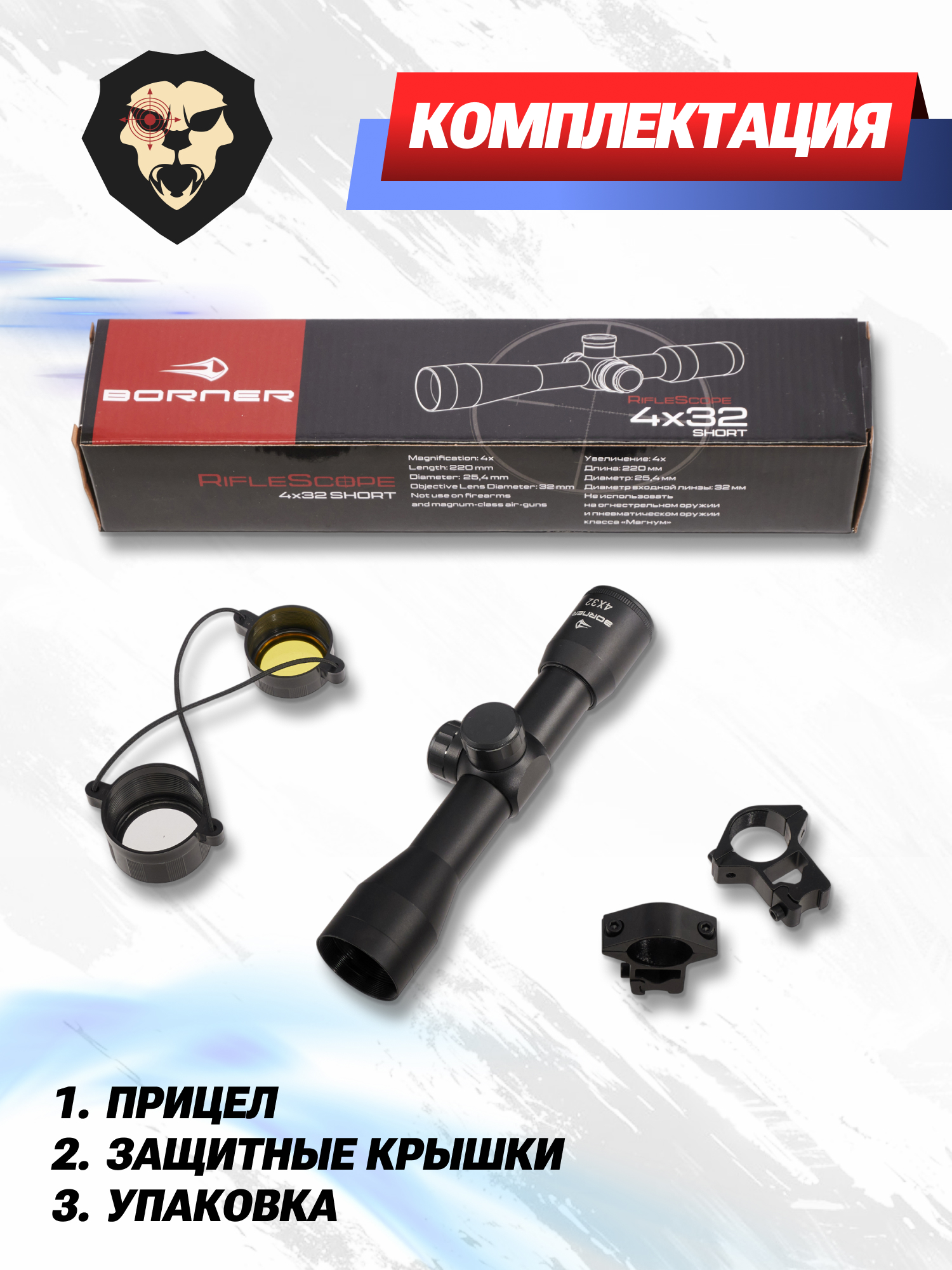 Информация о товаре "Оптический прицел Borner 4x32S" носит ознакомительный характер, и не является публичной офертой, определяемой положениями Статьи 437 Гражданского кодекса Российской Федерации, характеристики, внешний вид, цвет и комплектация могут быть изменены производителем без уведомления.