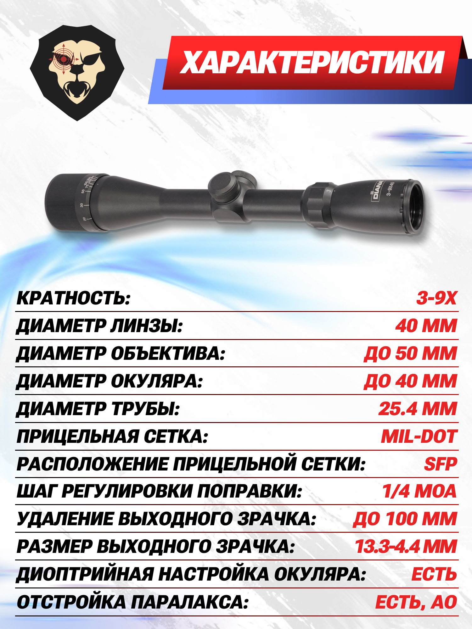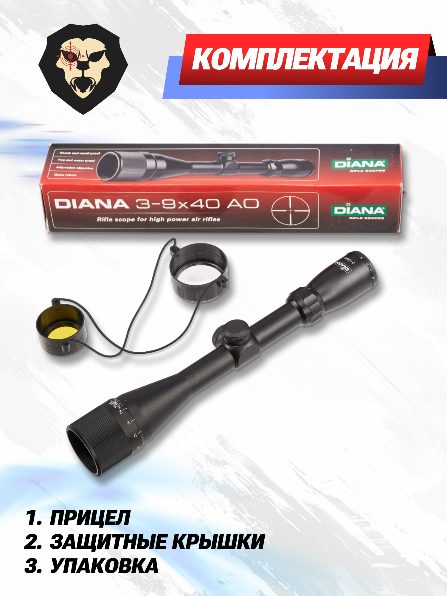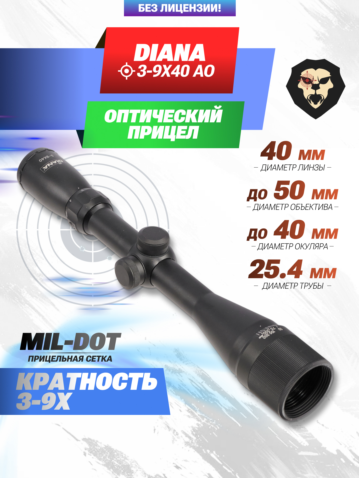 Информация о товаре "Оптический прицел Diana 3-9x40 AO (BH-DN39, 25.4 мм, Mil-Dot)" носит ознакомительный характер, и не является публичной офертой, определяемой положениями Статьи 437 Гражданского кодекса Российской Федерации, характеристики, внешний вид, цвет и комплектация могут быть изменены производителем без уведомления.