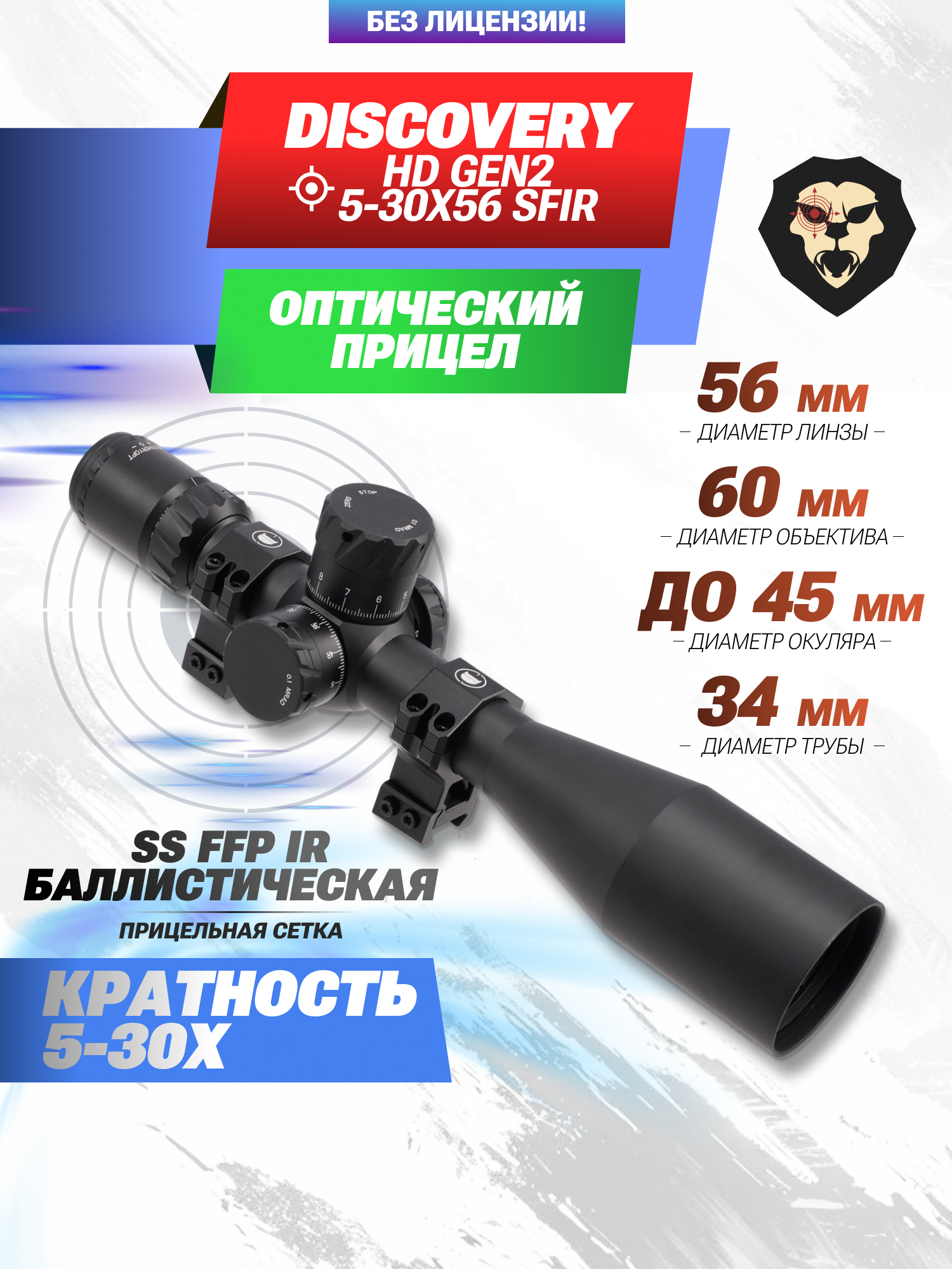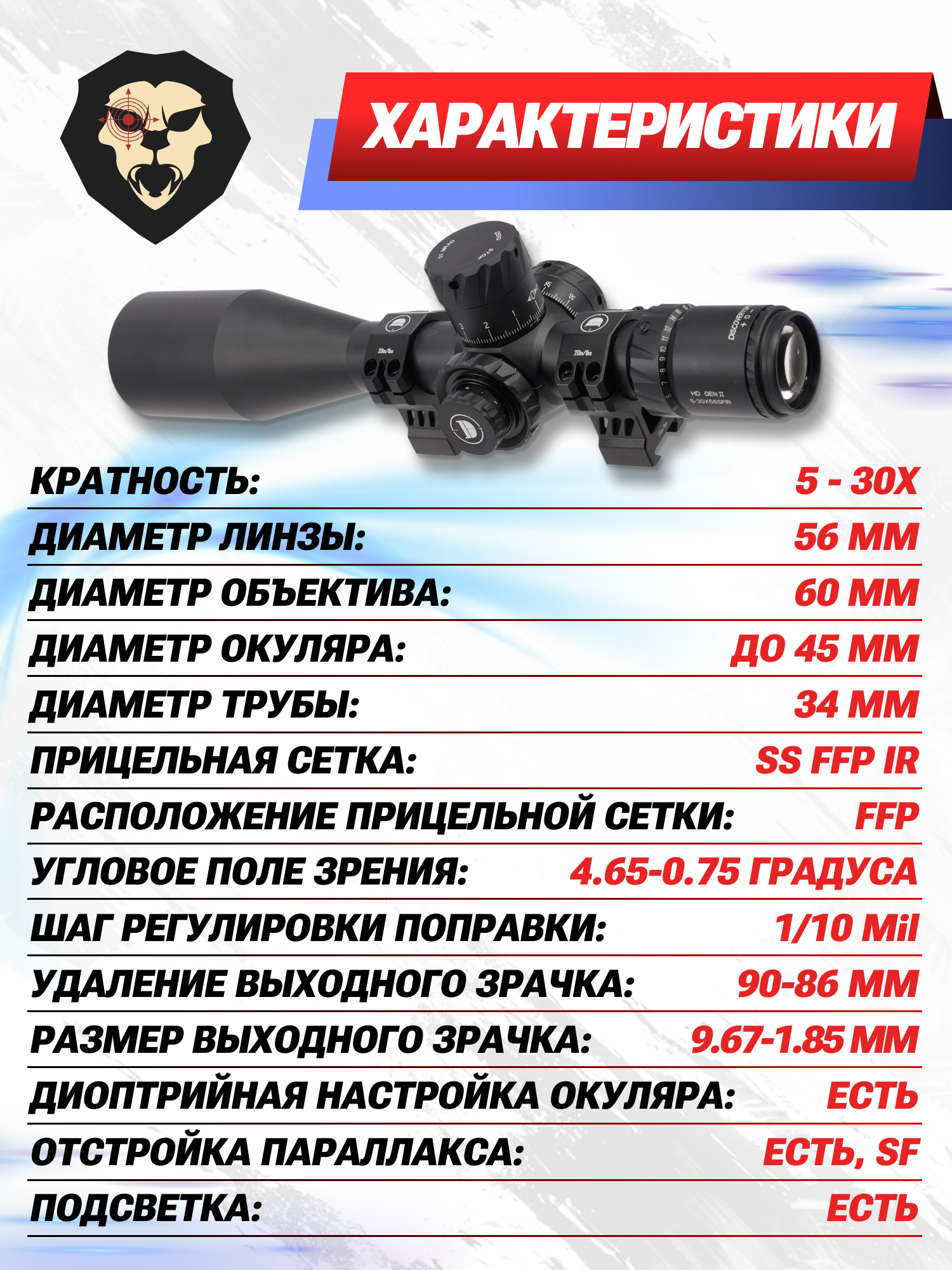 Информация о товаре "Оптический прицел Discovery HD Gen2 5-30x56 SFIR (34 мм, оригинал, Zero Stop)" носит ознакомительный характер, и не является публичной офертой, определяемой положениями Статьи 437 Гражданского кодекса Российской Федерации, характеристики, внешний вид, цвет и комплектация могут быть изменены производителем без уведомления.