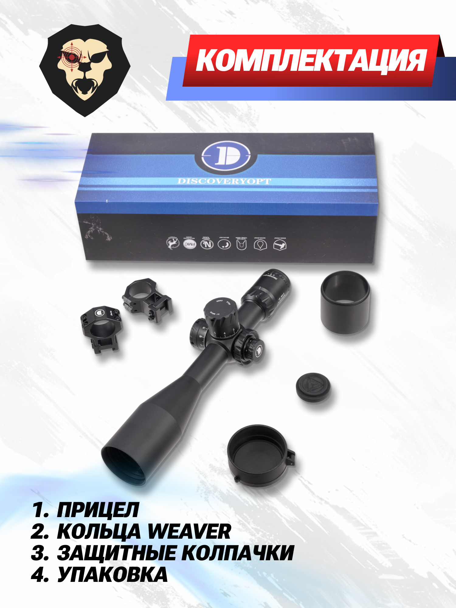 | Комплектация | Прицел, кольца-крепления Weaver, проставки для колец, противобликовая бленда, крышки для объектива и окуляра, салфетка, ключ-шестигранник, упаковка, документация |