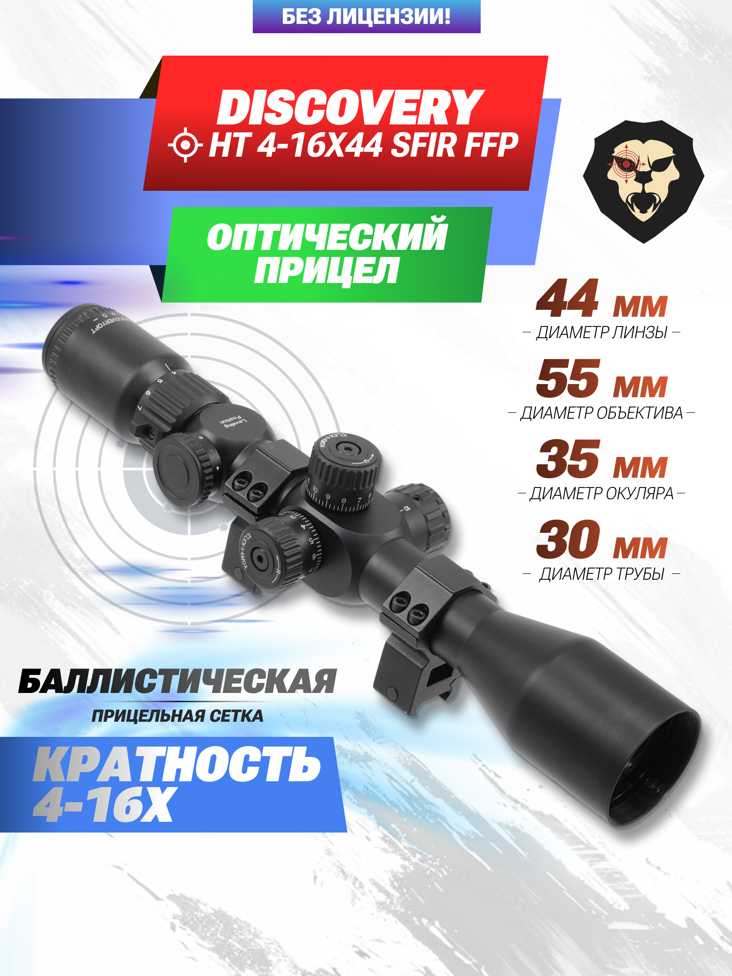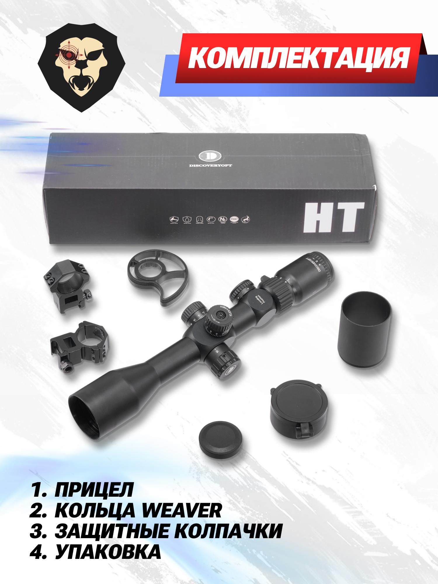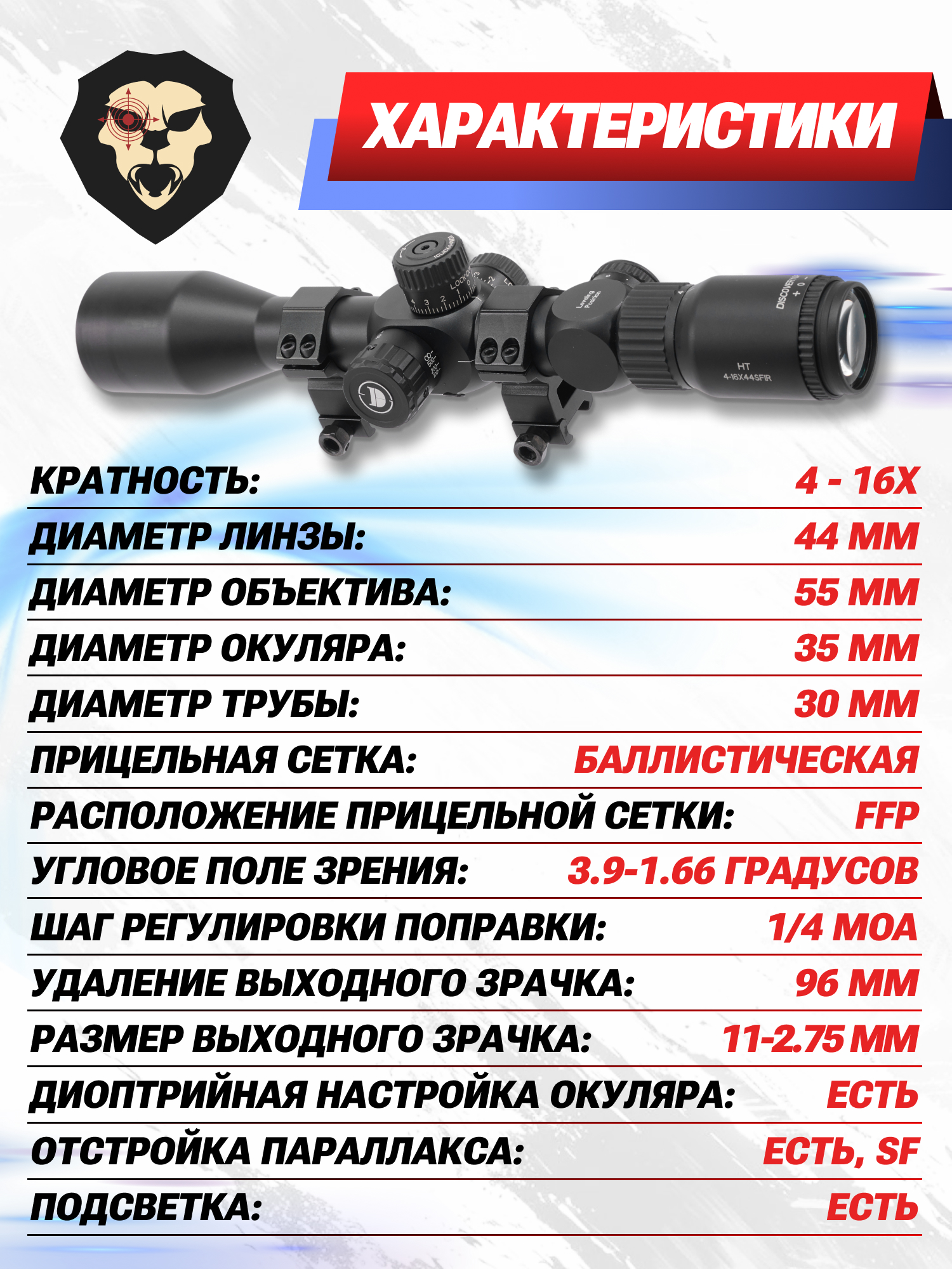 Информация о товаре "Оптический прицел Discovery HT 4-16x44 SFIR FFP (30 мм, 230701, подсветка, Weaver)" носит ознакомительный характер, и не является публичной офертой, определяемой положениями Статьи 437 Гражданского кодекса Российской Федерации, характеристики, внешний вид, цвет и комплектация могут быть изменены производителем без уведомления.