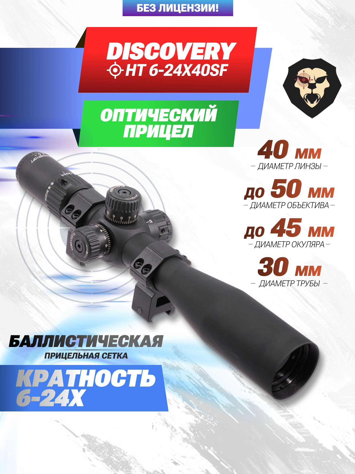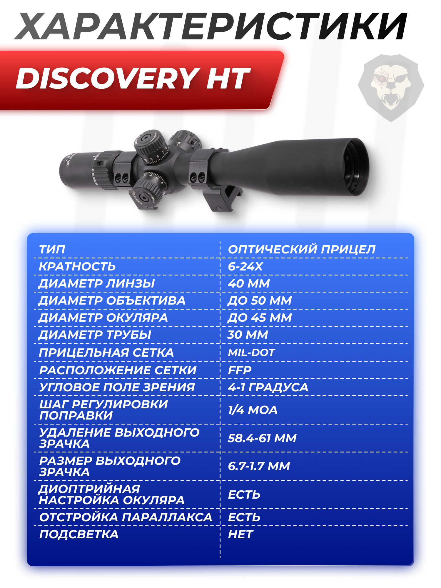 Информация о товаре "Оптический прицел Discovery HT 6-24x40SF (30 мм, оригинал, FFP)" носит ознакомительный характер, и не является публичной офертой, определяемой положениями Статьи 437 Гражданского кодекса Российской Федерации, характеристики, внешний вид, цвет и комплектация могут быть изменены производителем без уведомления.