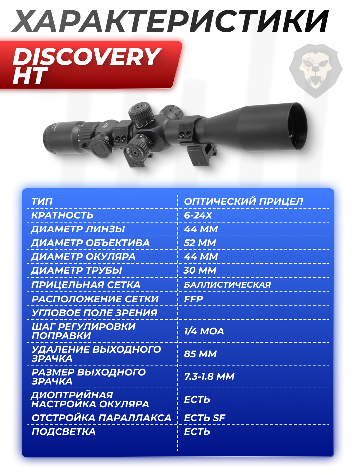 Информация о товаре "Оптический прицел Discovery HT 6-24x44 SFIR FFP (30 мм, 230702, подсветка, Weaver)" носит ознакомительный характер, и не является публичной офертой, определяемой положениями Статьи 437 Гражданского кодекса Российской Федерации, характеристики, внешний вид, цвет и комплектация могут быть изменены производителем без уведомления.