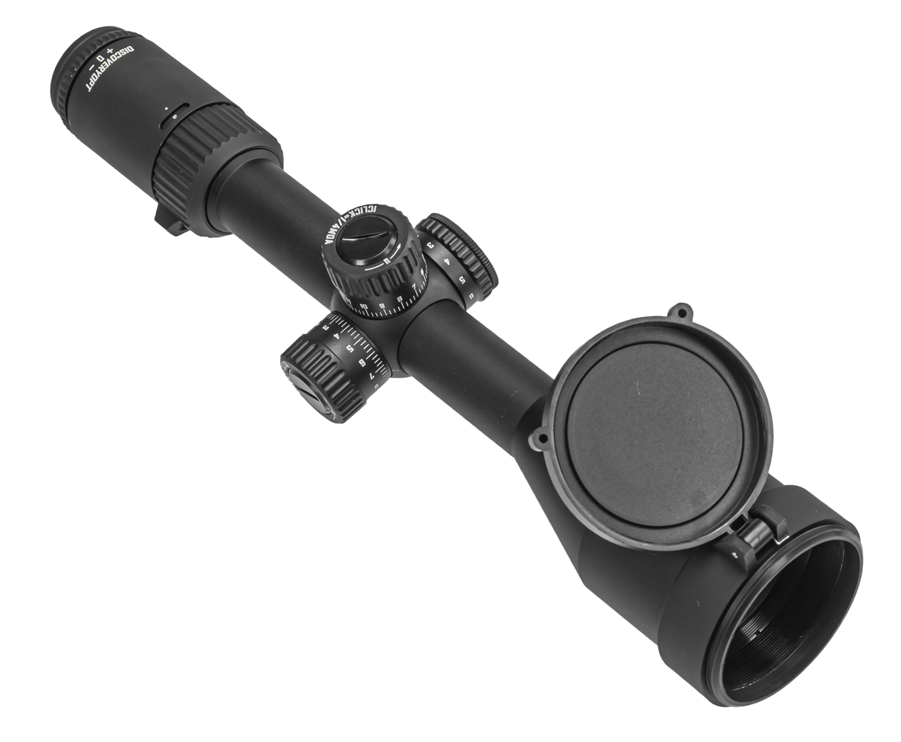 Прецизионный механизм выверки обеспечивает точный ввод поправок и исключает случайное изменение настроек. Тактические турели всегда открыты, что устраняет потребность в демонтаже колпачков и оснащаются блокировкой Push-pull типа. Вращение маховиков сопровождается отчетливыми щелчками - с каждым кликом сетка смещается на четверть угловой минуты в выбранном направлении по горизонтали или вертикали.
