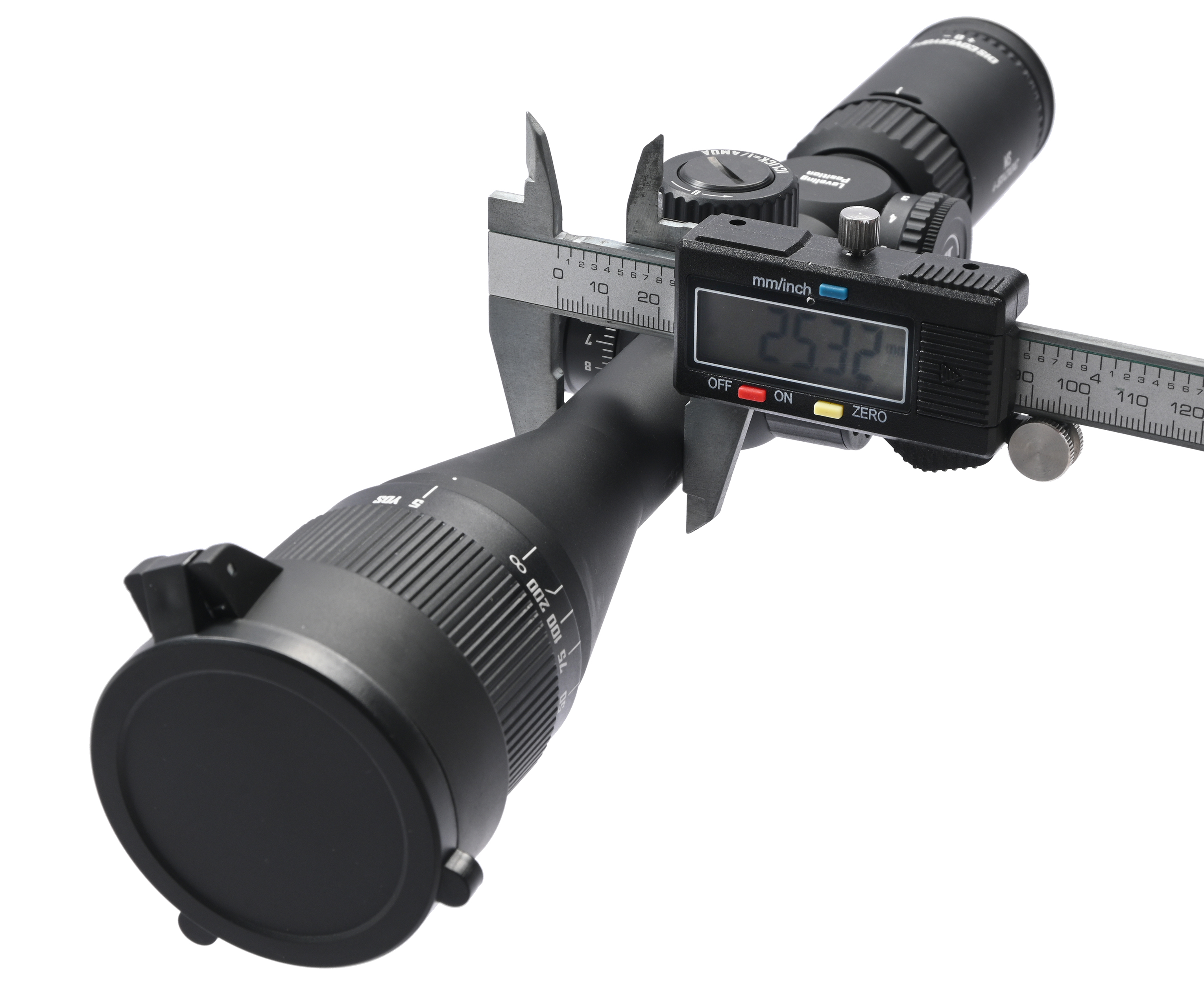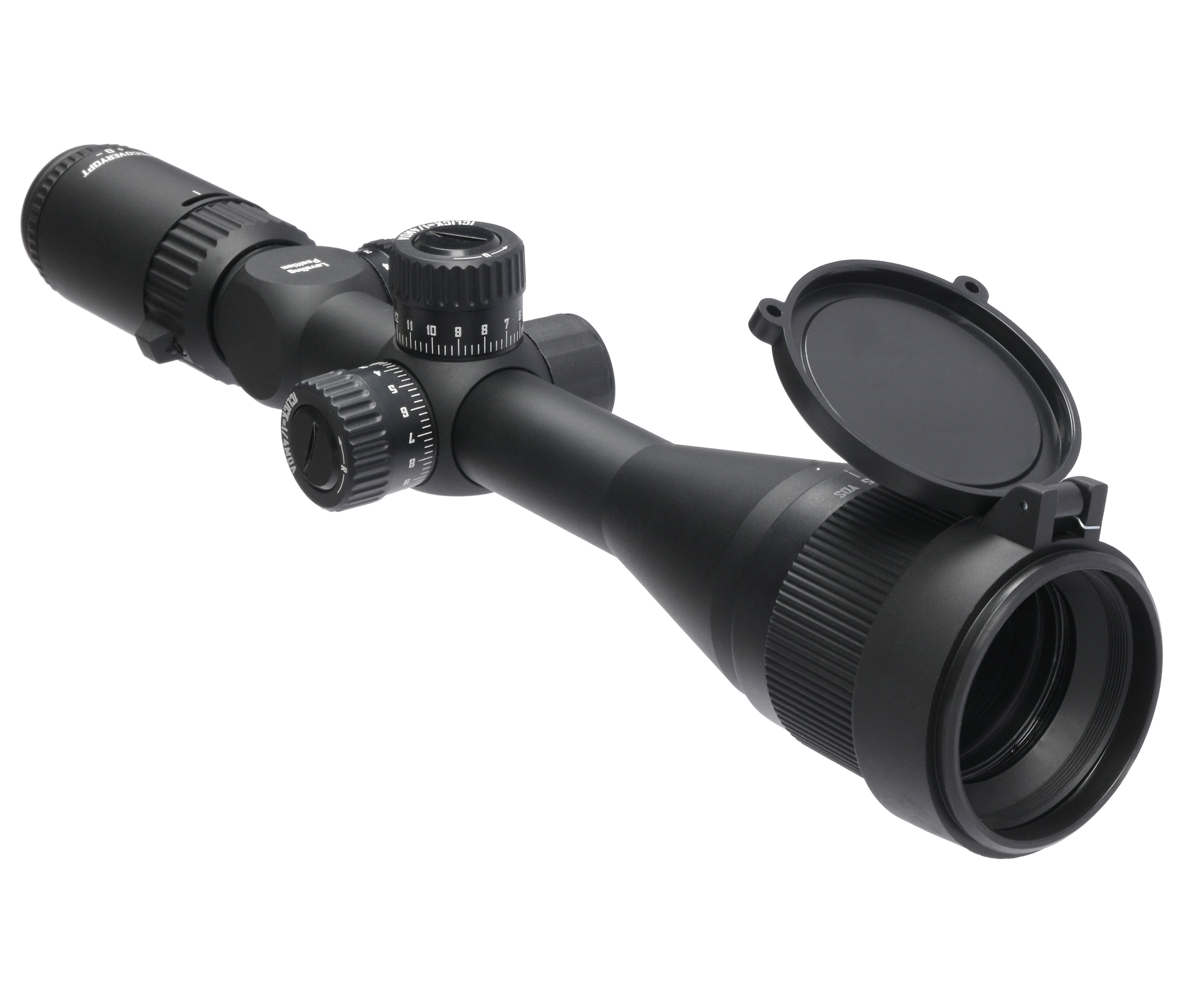 Объектив совмещен с узлом регулировки параллакса AO. Для удобства на корпусе нанесена шкала дальности в ярдах. Минимальная дистанция в метрической системе для корректного функционирования составляет 9 метров.
