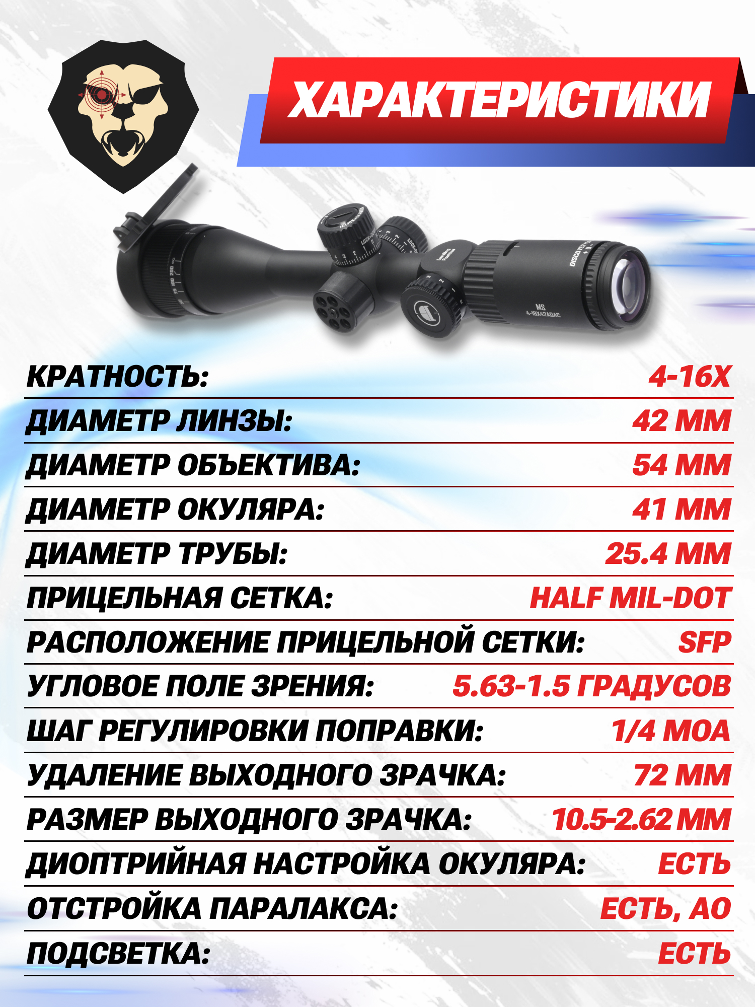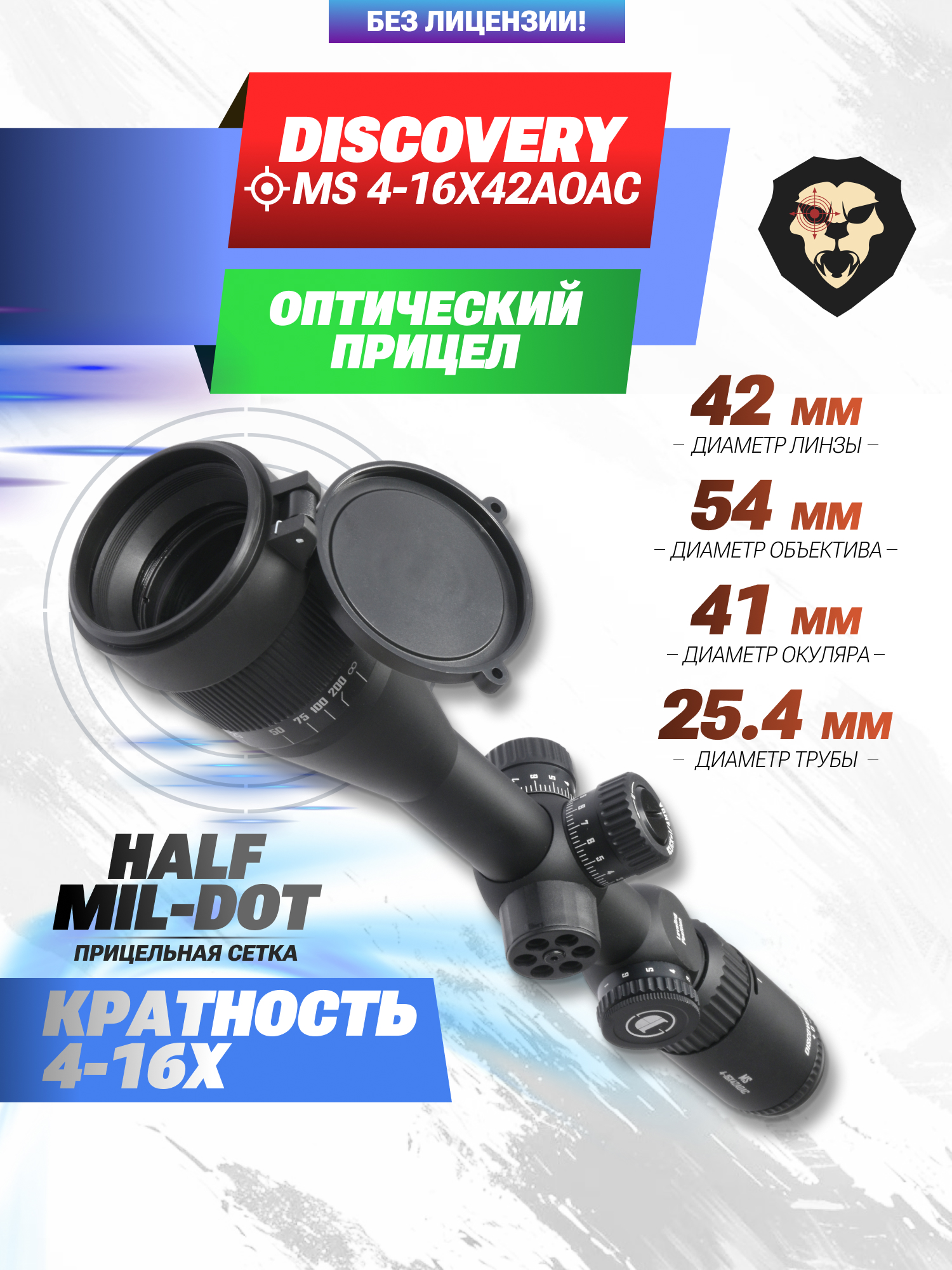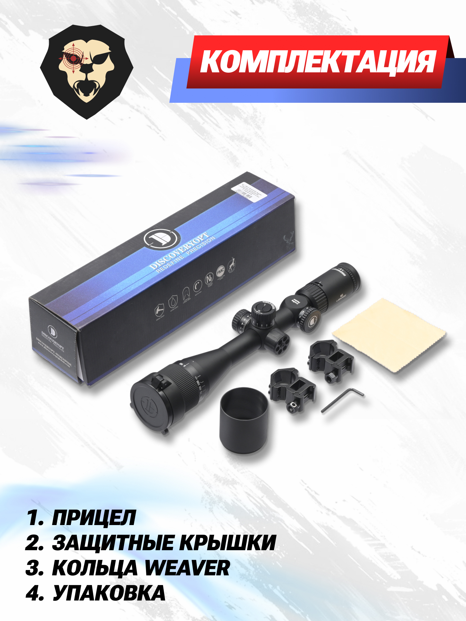 Информация о товаре "Оптический прицел Discovery MS 4-16x42AOAC (Вивер, 25.4 мм)" носит ознакомительный характер, и не является публичной офертой, определяемой положениями Статьи 437 Гражданского кодекса Российской Федерации, характеристики, внешний вид, цвет и комплектация могут быть изменены производителем без уведомления.
