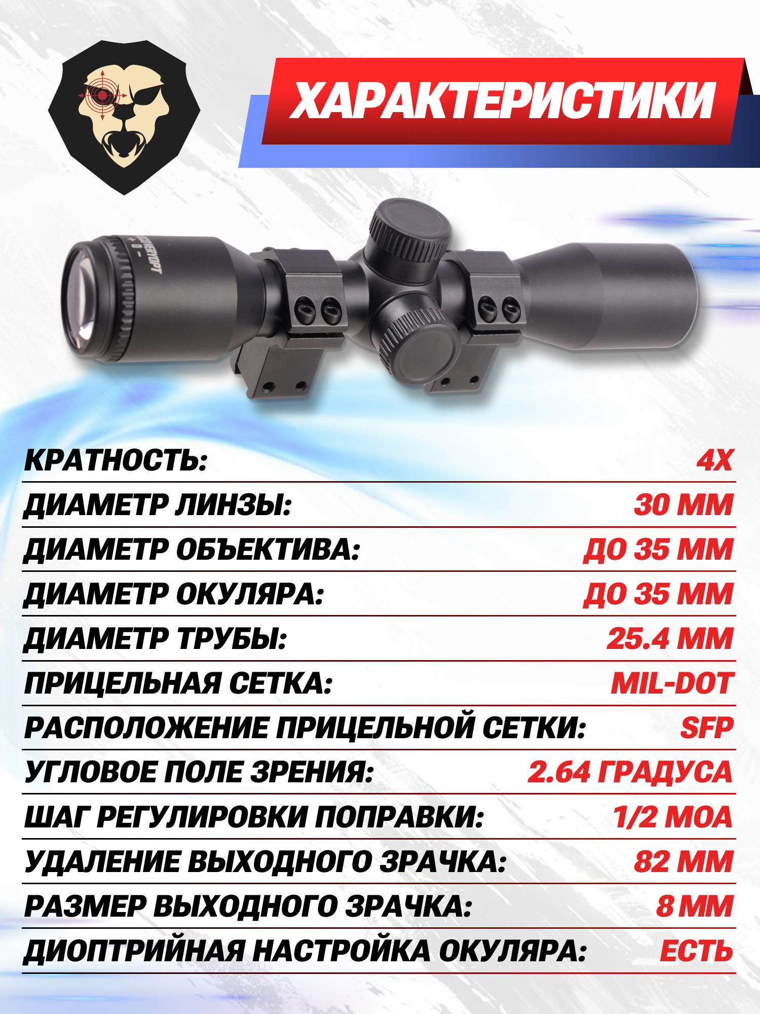 | Диаметр трубы прицела | 25.4 мм |