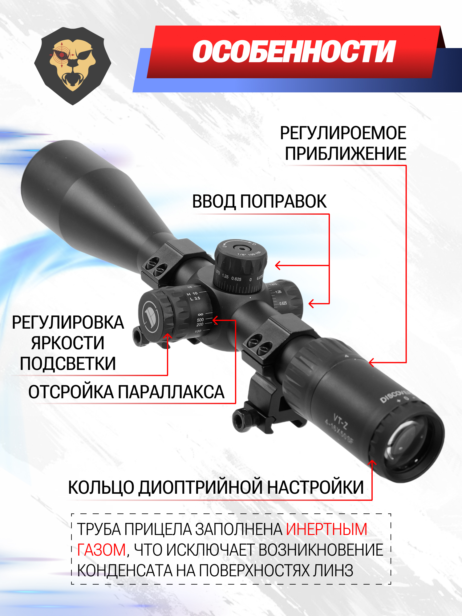 Представленный прицел Discovery VT-Z 4-16x50SF предназначен для выслеживания целей и их точного поражения на высокой дистанции от стрелка. Наличие в основе оптической системы объективной линзы диаметром 50 мм формирует повышенную освещенность и контрастность наблюдаемой картинки, даже при использовании в условиях недостатка естественного освещения, например, в сумерках или на рассвете.