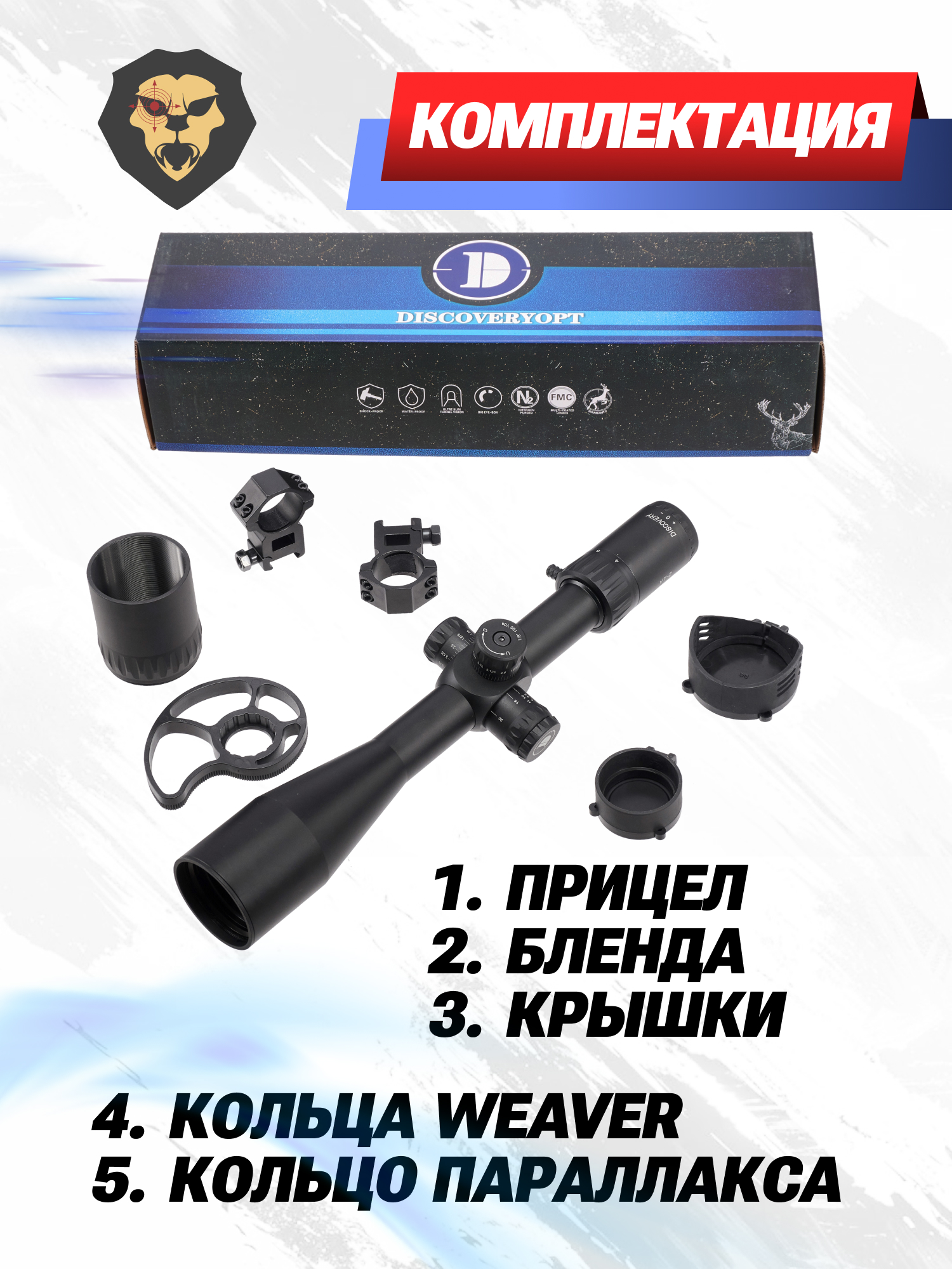 | Комплектация | Прицел, кольца-крепления Weaver, противобликовая бленда, крышки для объектива и окуляра, салфетка, ключ-шестигранник, упаковка, документация |