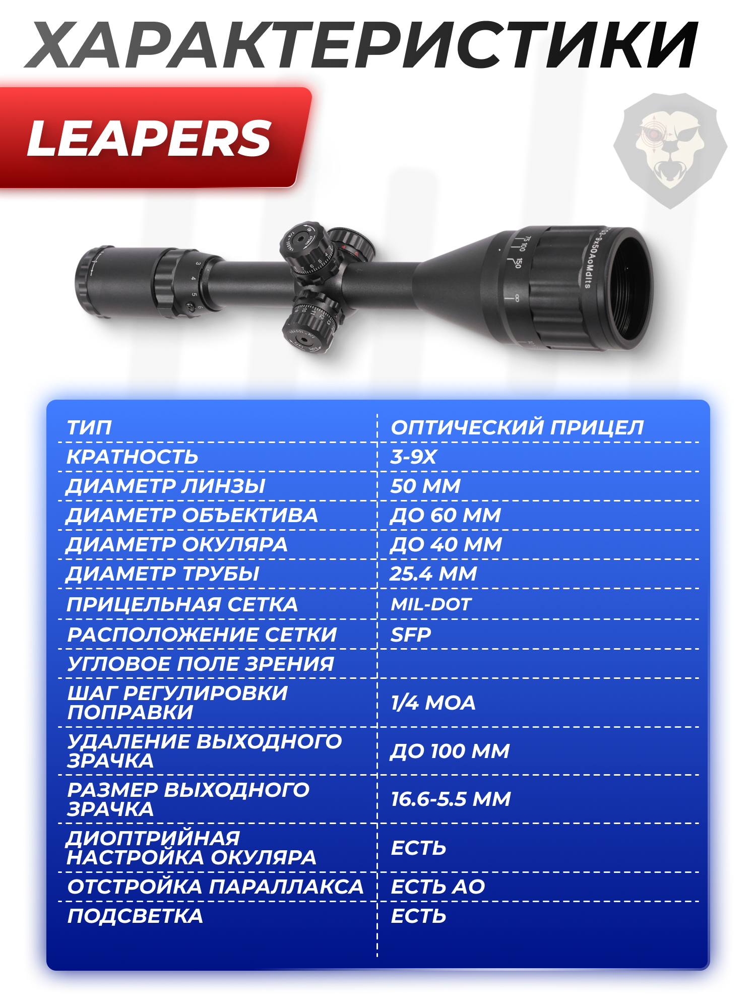 Информация о товаре "Оптический прицел Leapers 3-9x50 AOE (SCP-M395AOMDLTS, UTG395L, 25.4 мм, подсветка)" носит ознакомительный характер, и не является публичной офертой, определяемой положениями Статьи 437 Гражданского кодекса Российской Федерации, характеристики, внешний вид, цвет и комплектация могут быть изменены производителем без уведомления.
