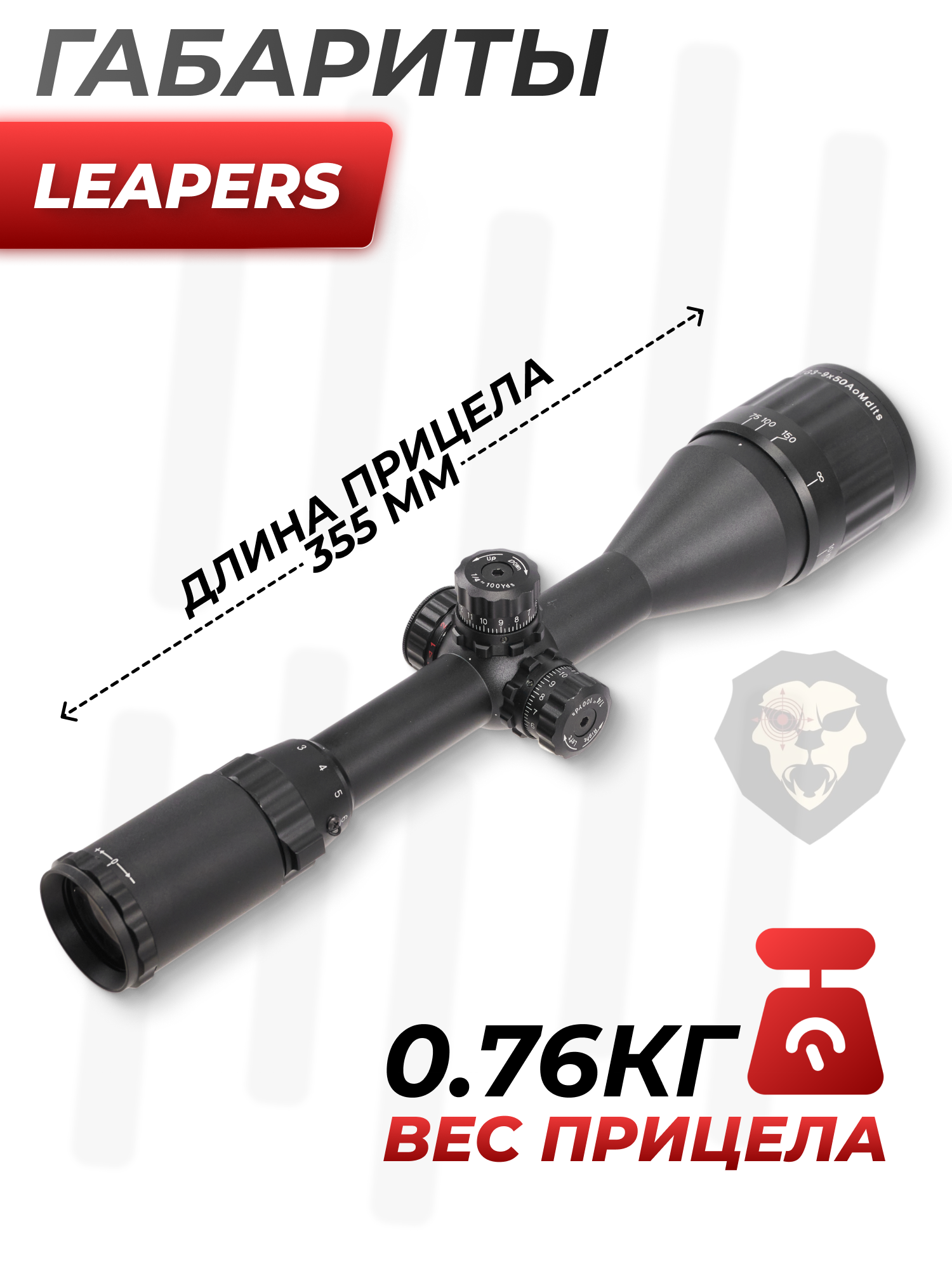 Обозреваемый оптический прицел Leapers представлен в цилиндрическом корпусе с шириной центральной части в 25.4 миллиметра. Указанный размер позволяет фиксировать устройство на рельсовых системах посредством подходящих крепежных элементов с идентичными габаритами отверстий. Стоит отметить, что в роли материала для изготовления используется алюминиевый авиационный металл, который обеспечивает снижение массы изделия до 0.73 килограмма при длине в 360 миллиметров.