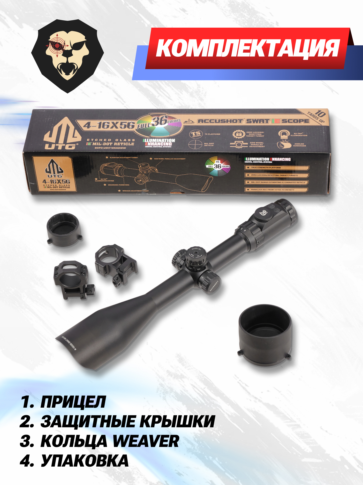 | Комплектация | Прицел, кольца Weaver, защитные крышки, батарейка СR2032, салфетка, упаковка, документация |
