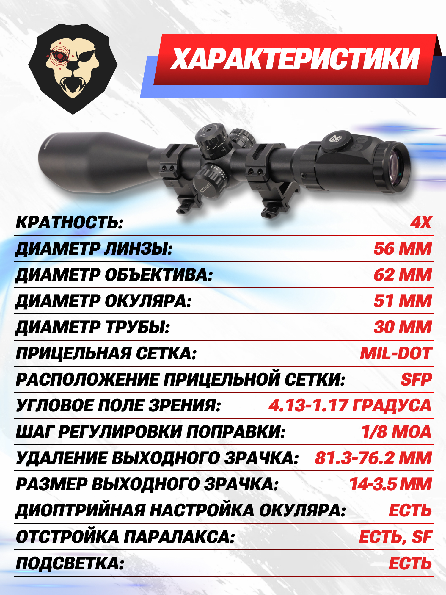| Диаметр трубы прицела | 30 мм |