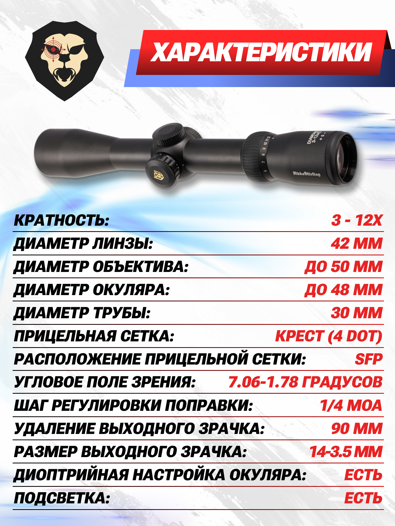 Информация о товаре "Оптический прицел Nikko Stirling Diamond 3-12x42 (No 4 Dot, 30 мм, с подсветкой)" носит ознакомительный характер, и не является публичной офертой, определяемой положениями Статьи 437 Гражданского кодекса Российской Федерации, характеристики, внешний вид, цвет и комплектация могут быть изменены производителем без уведомления.