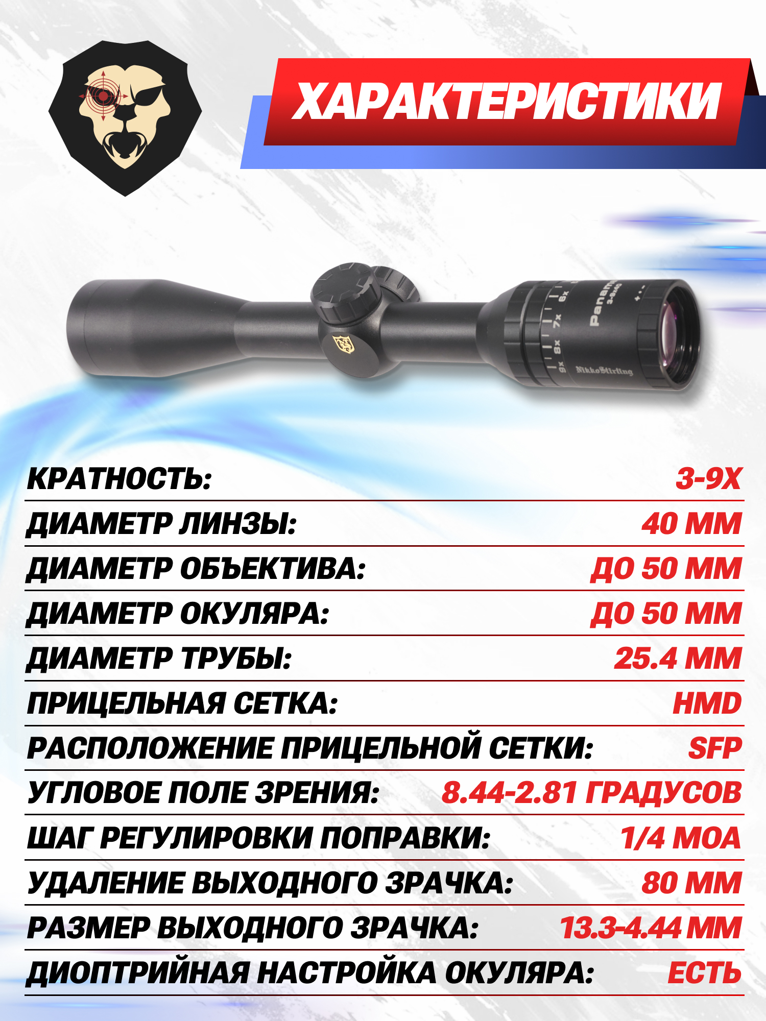Информация о товаре "Оптический прицел Nikko Stirling Panamax 3-9x40 (HMD, 25.4 мм)" носит ознакомительный характер, и не является публичной офертой, определяемой положениями Статьи 437 Гражданского кодекса Российской Федерации, характеристики, внешний вид, цвет и комплектация могут быть изменены производителем без уведомления.