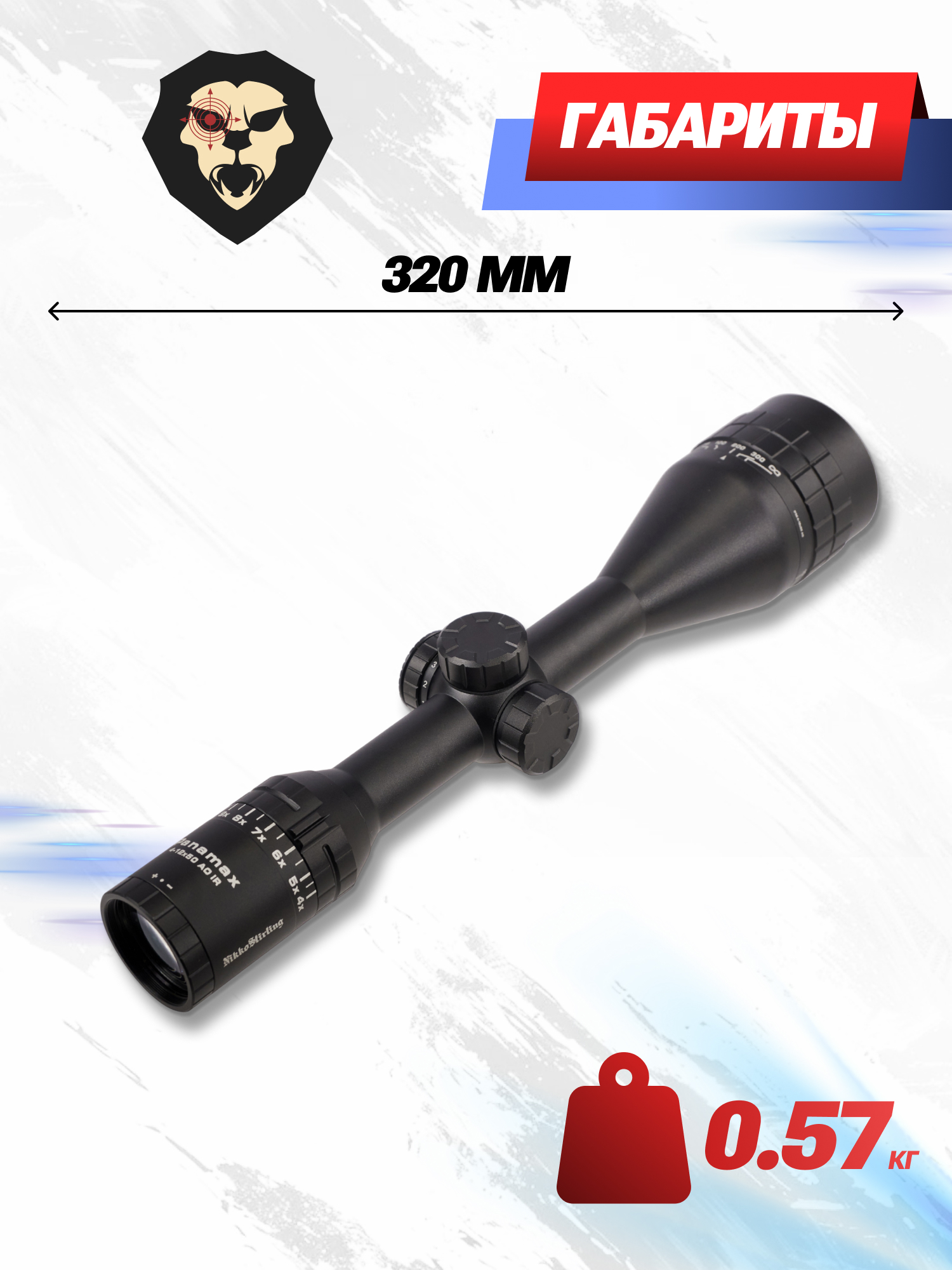 Размер изделия составляет 32 сантиметра, а вес оптики не превышает 570 грамм. Линзы не запотеют при эксплуатации в суровых условиях с сильной влажностью или во время перепадов температуры, так как внутреннее пространство герметичного прицела заполняется инертным газом. Для защиты стекол при транспортировке и хранении оборудования в комплекте идут съемные крышки.