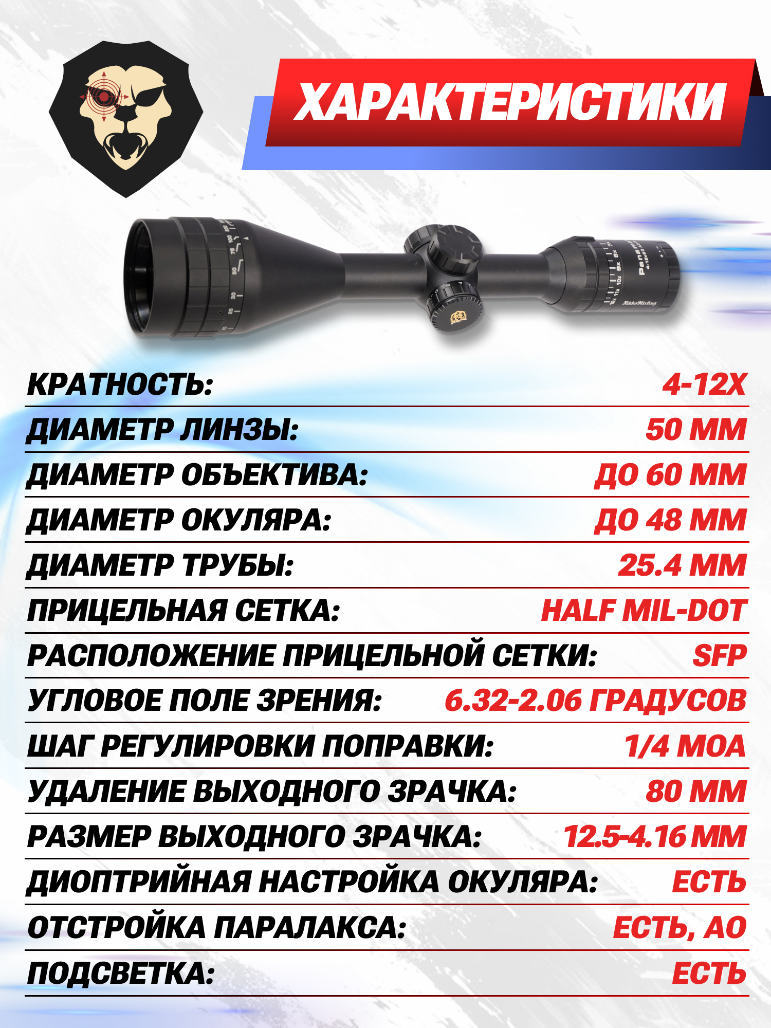Информация о товаре "Оптический прицел Nikko Stirling Panamax 4-12x50 AO IR (25.4 мм, подсветка, Half MD)" носит ознакомительный характер, и не является публичной офертой, определяемой положениями Статьи 437 Гражданского кодекса Российской Федерации, характеристики, внешний вид, цвет и комплектация могут быть изменены производителем без уведомления.
