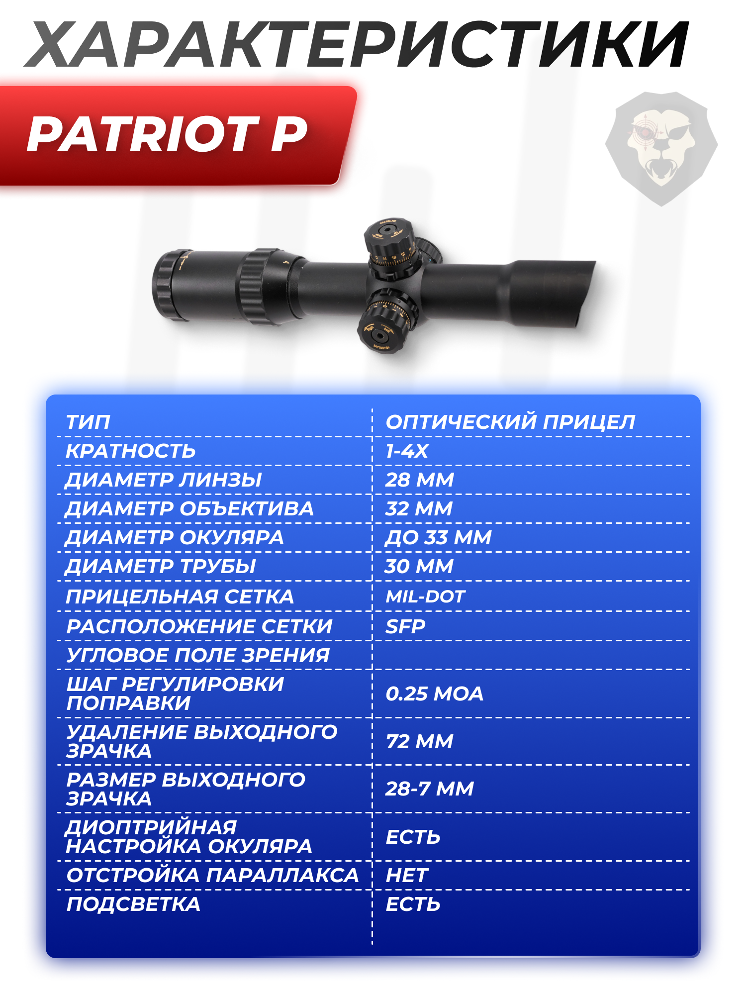 Оптический прицел Patriot P1-4х28EG (30 мм, Mil-Dot, BH-PT148G) купить в интернет-магазине Popadiv10.