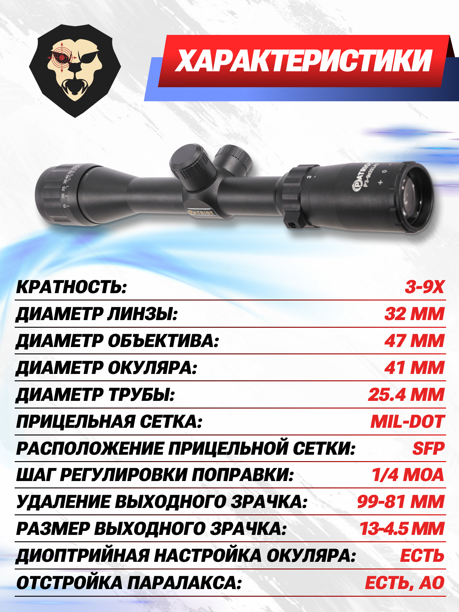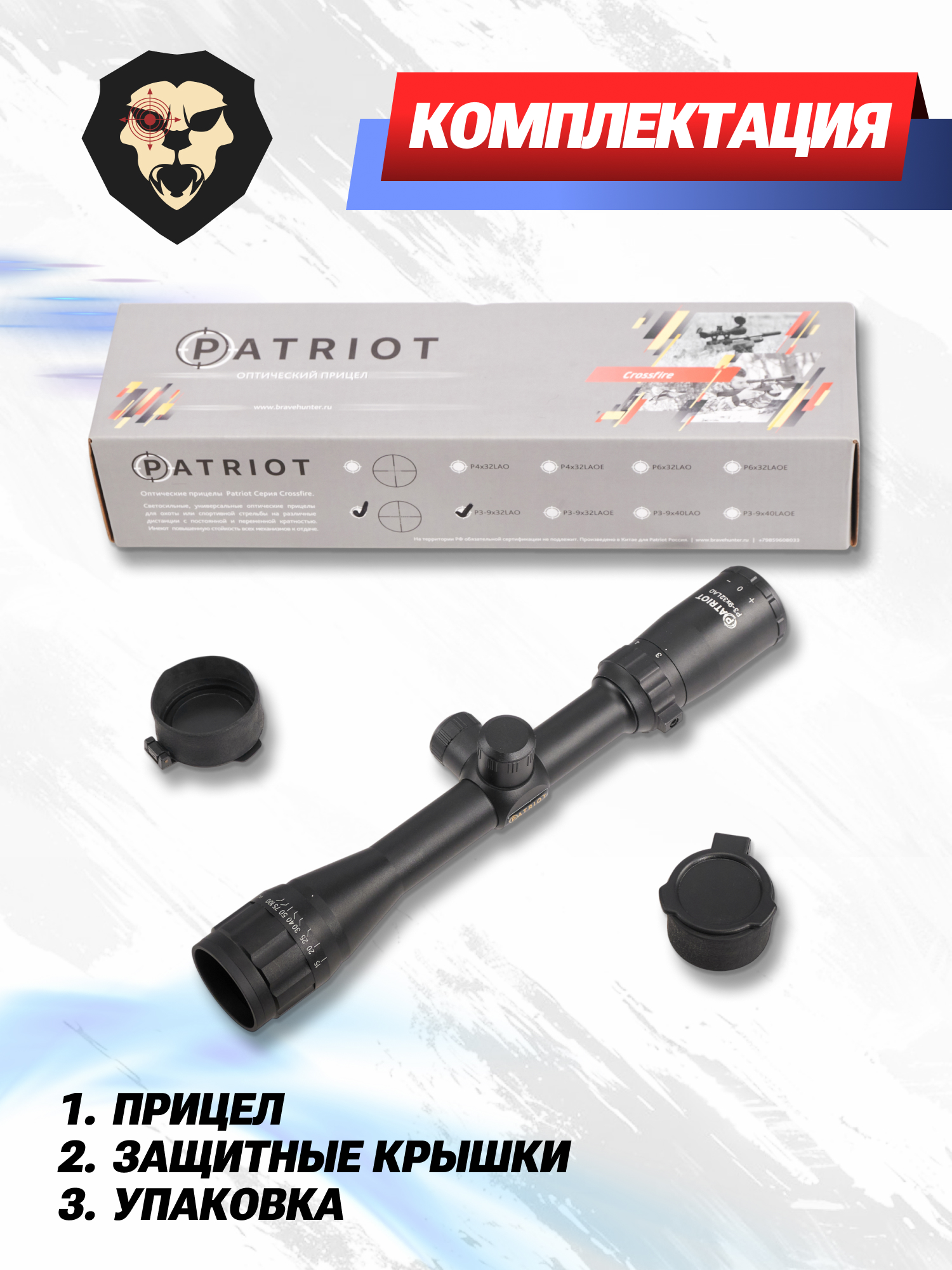 Информация о товаре "Оптический прицел Patriot Crossfire P3-9x32 LAO Mil-Dot (BH-PT393AO, 25.4 мм)" носит ознакомительный характер, и не является публичной офертой, определяемой положениями Статьи 437 Гражданского кодекса Российской Федерации, характеристики, внешний вид, цвет и комплектация могут быть изменены производителем без уведомления.