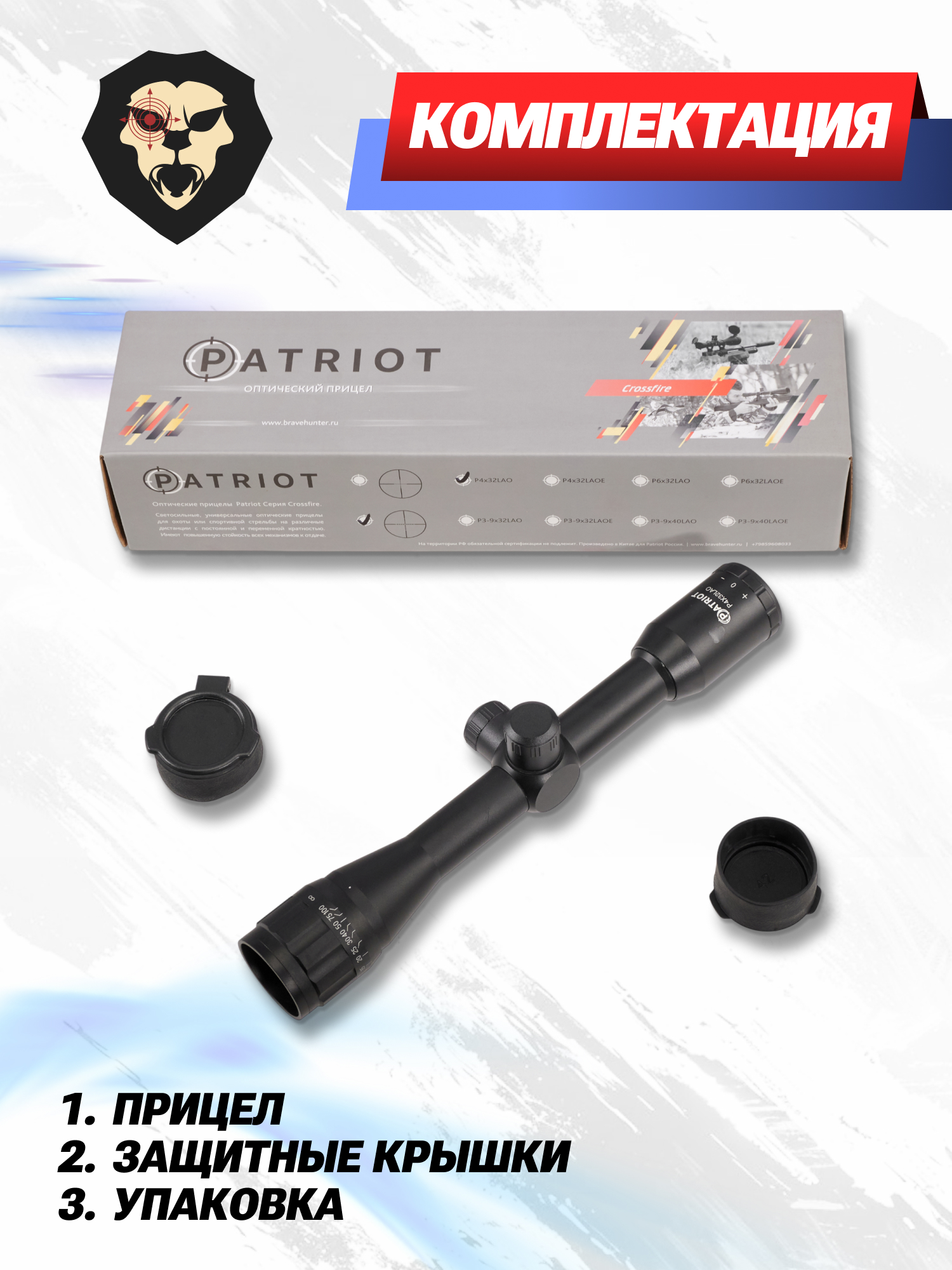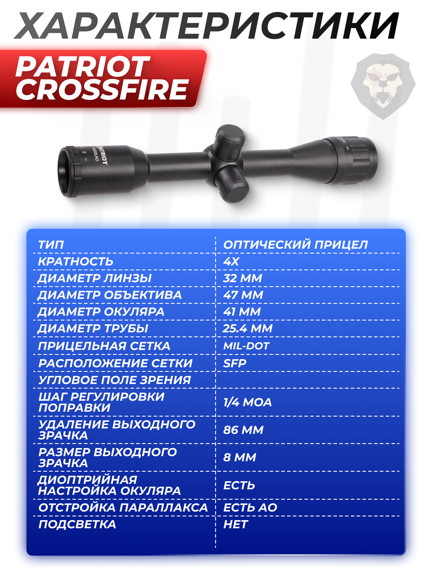 Информация о товаре "Оптический прицел Patriot Crossfire 4х32 LAO Mil-Dot (BH-PT43AO, 25.4 мм)" носит ознакомительный характер, и не является публичной офертой, определяемой положениями Статьи 437 Гражданского кодекса Российской Федерации, характеристики, внешний вид, цвет и комплектация могут быть изменены производителем без уведомления.