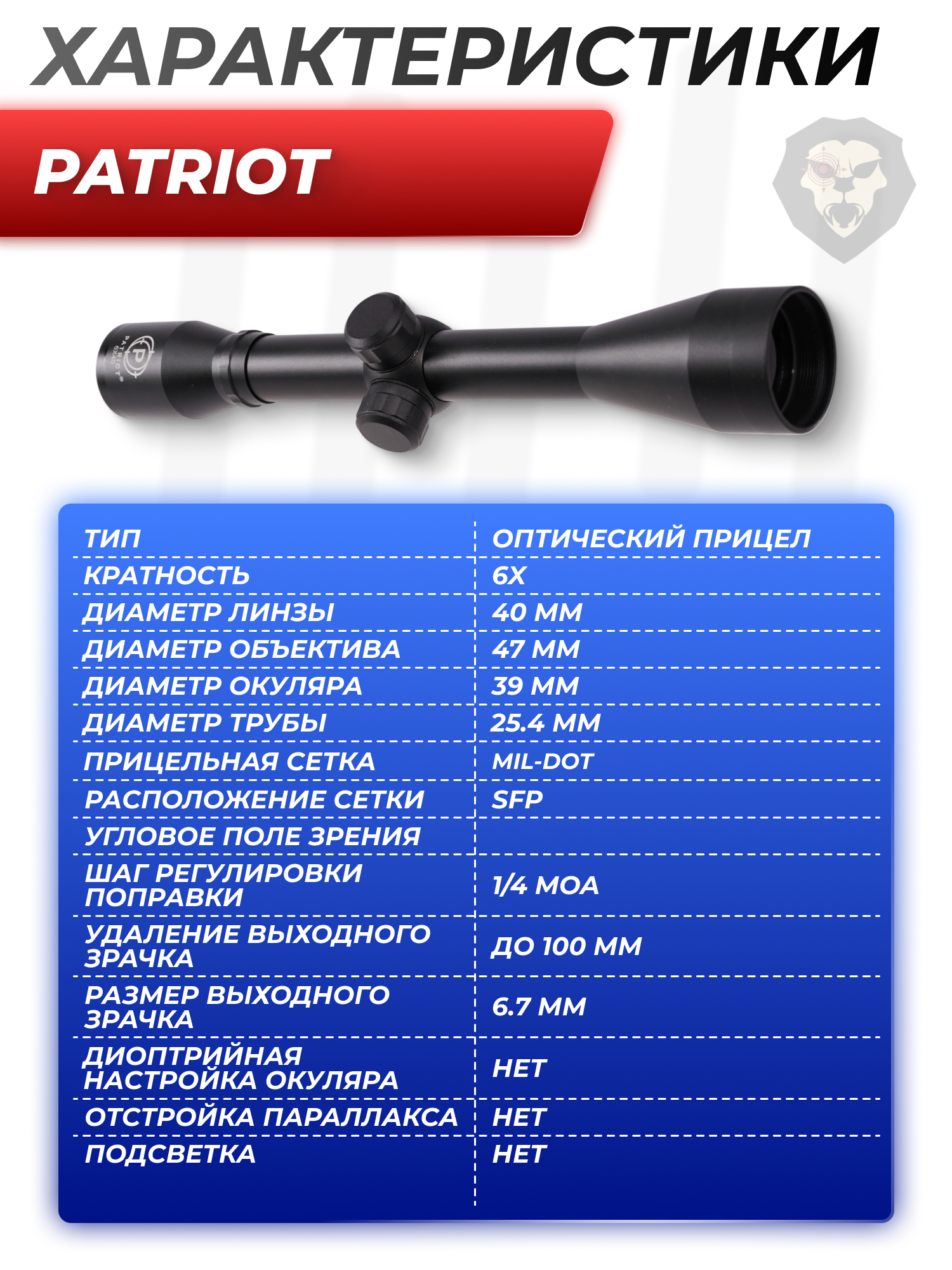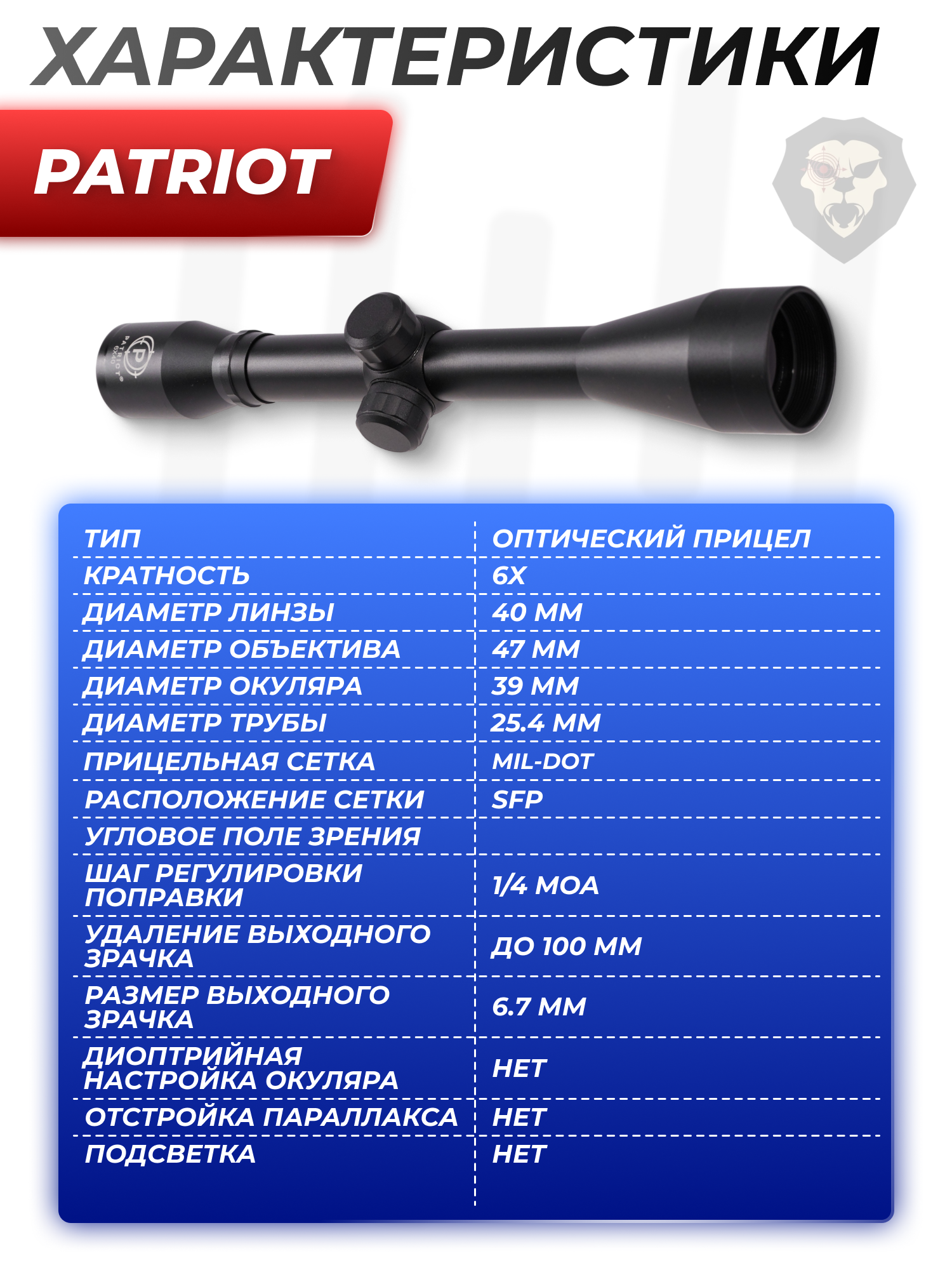 Информация о товаре "Оптический прицел Patriot 6x40 Mil-Dot (BH-PT64, 25.4 мм)" носит ознакомительный характер, и не является публичной офертой, определяемой положениями Статьи 437 Гражданского кодекса Российской Федерации, характеристики, внешний вид, цвет и комплектация могут быть изменены производителем без уведомления.