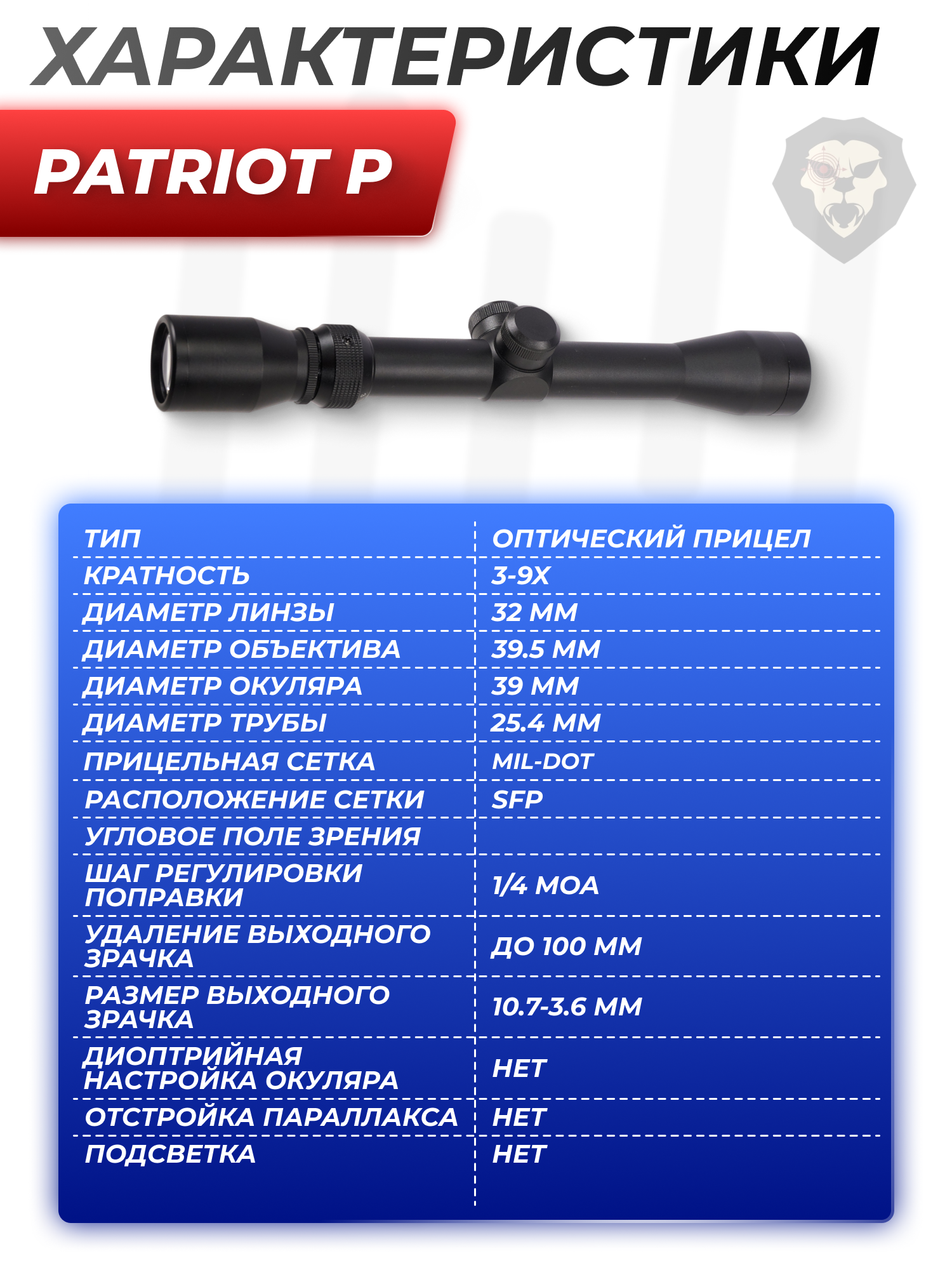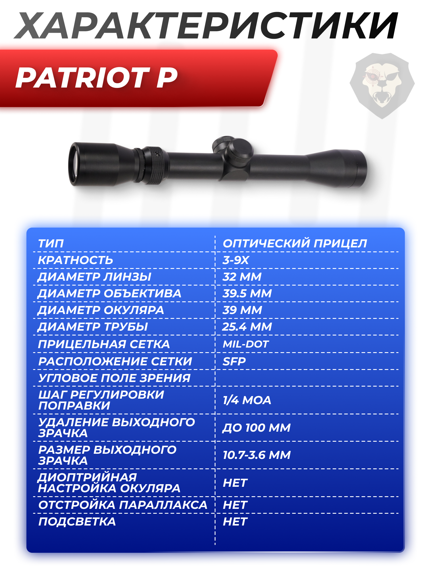 Информация о товаре "Оптический прицел Patriot P3-9x32 Mil-Dot (BH-PT393, 25.4 мм)" носит ознакомительный характер, и не является публичной офертой, определяемой положениями Статьи 437 Гражданского кодекса Российской Федерации, характеристики, внешний вид, цвет и комплектация могут быть изменены производителем без уведомления.