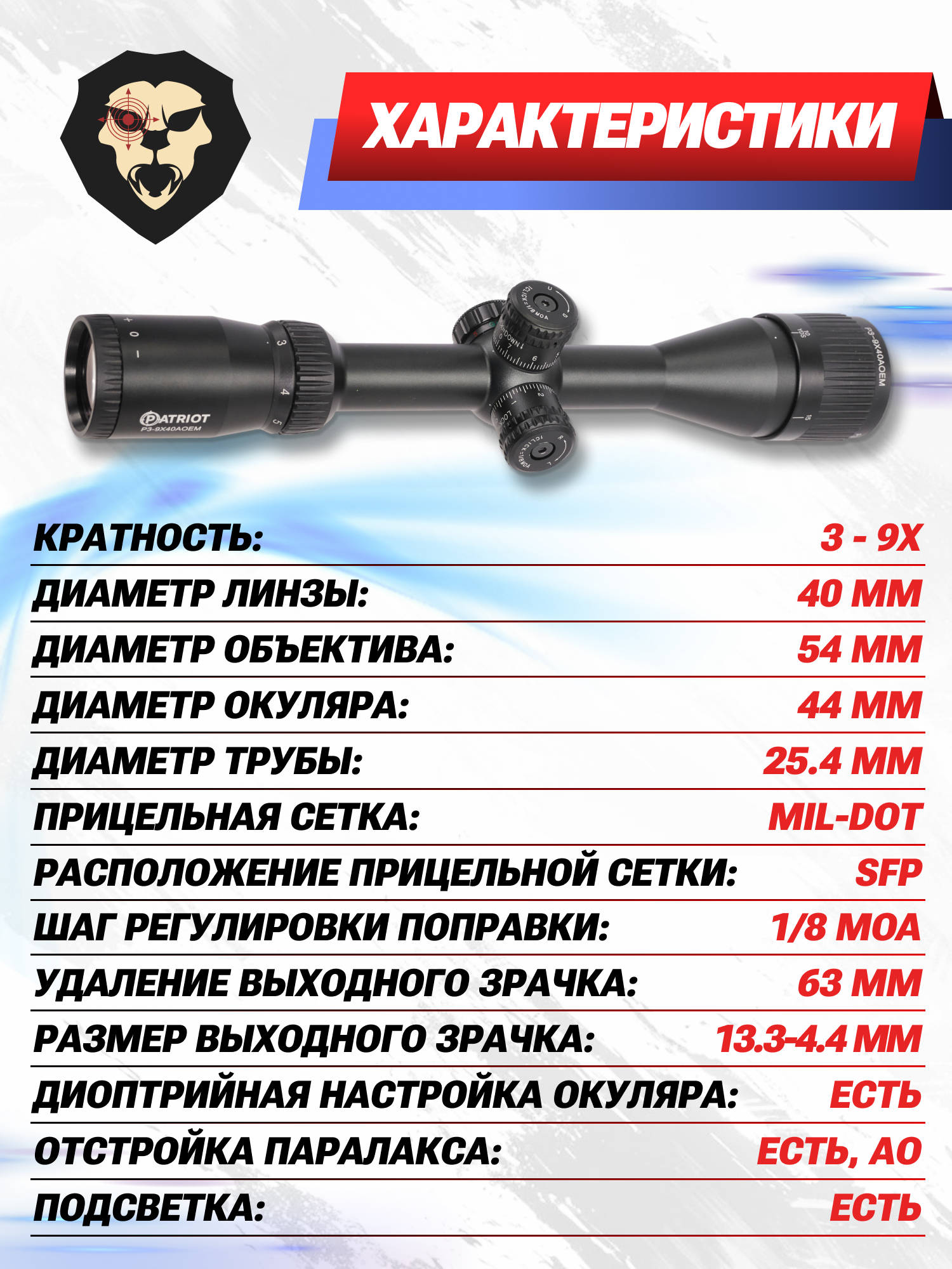 Оптический прицел Patriot Trophy P3-9x40 AOEM Mil-Dot (BH-PT394EM, 25.4 мм) купить в интернет-магазине Popadiv10.
