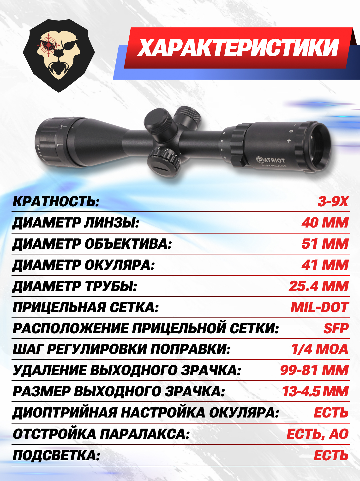 Оптический прицел Patriot P3-9x40 LAOE Mil-Dot (с подсветкой, BH-PT394AOE, 25.4 мм) купить в интернет-магазине Popadiv10.